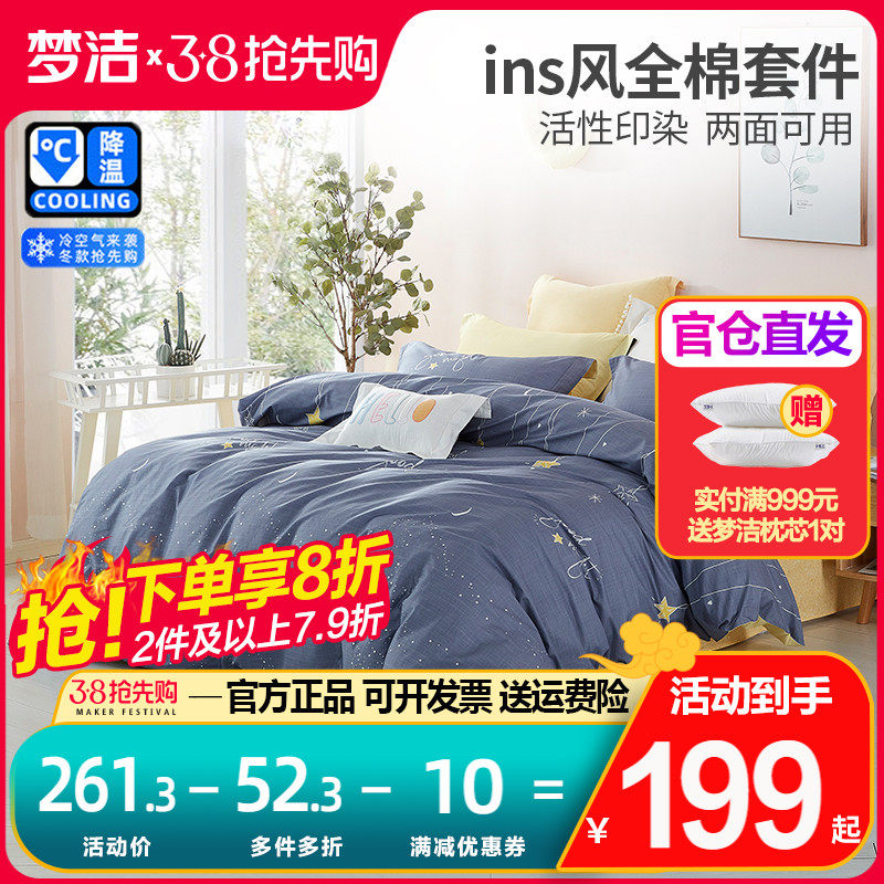 梦洁家纺四件套100纯棉全棉被套床单三件套印花北欧套件床上用品4