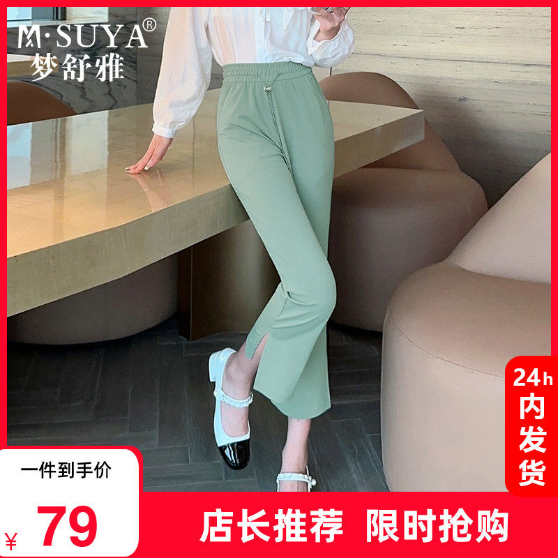 梦舒雅开叉微喇裤女后松紧腰2024春秋新款高腰显瘦垂感休闲喇叭裤