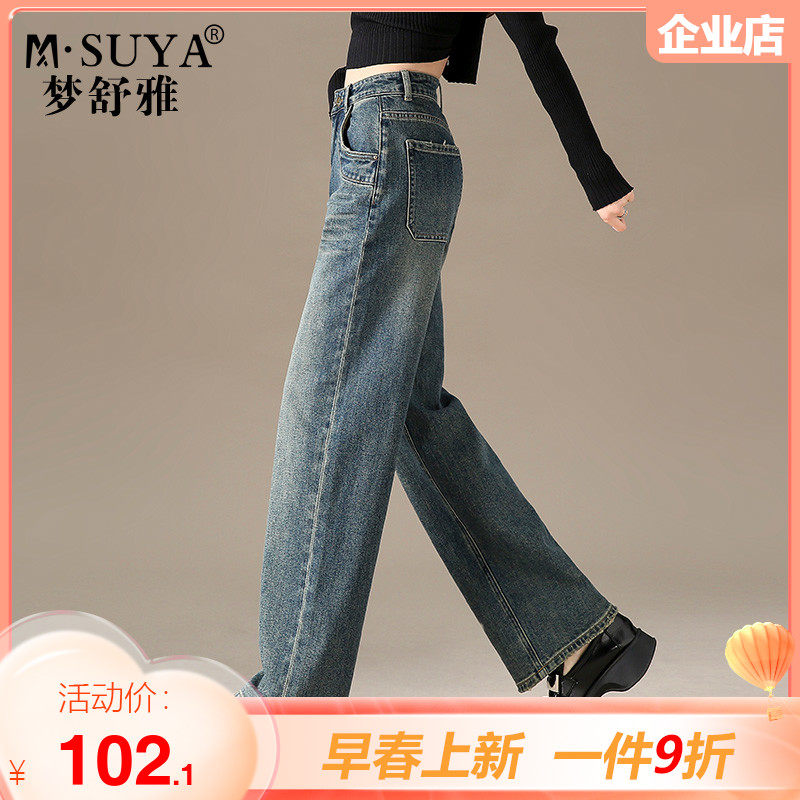 梦舒雅阔腿牛仔裤女2023新款春秋窄版高腰宽松休闲垂感直筒牛仔蓝