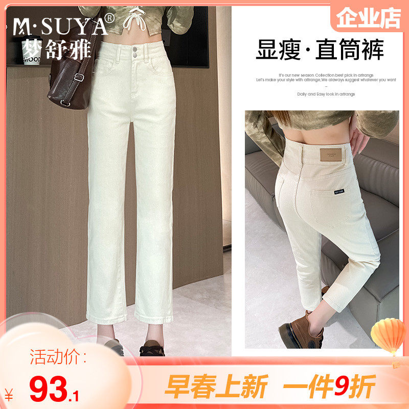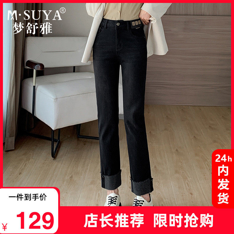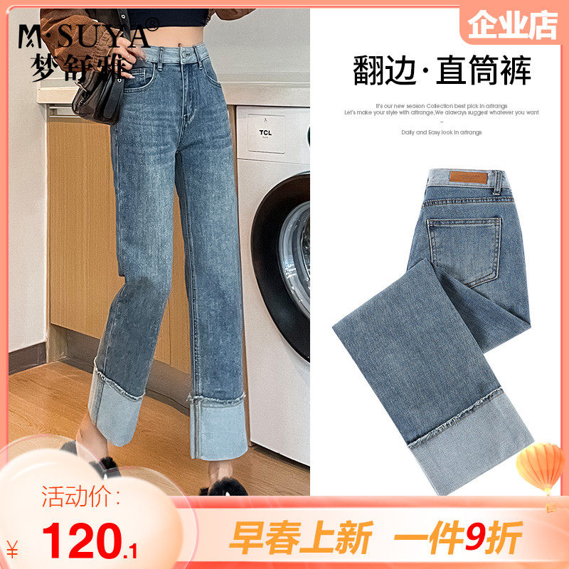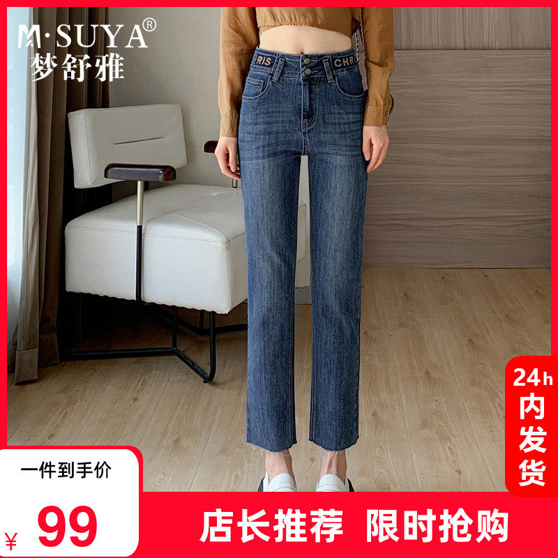 梦舒雅卷边直筒牛仔裤女春秋新款高腰显瘦九分小个子法棍烟管裤子