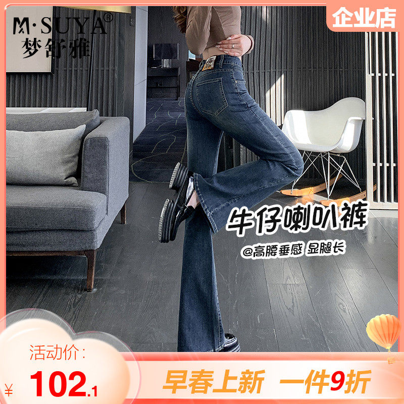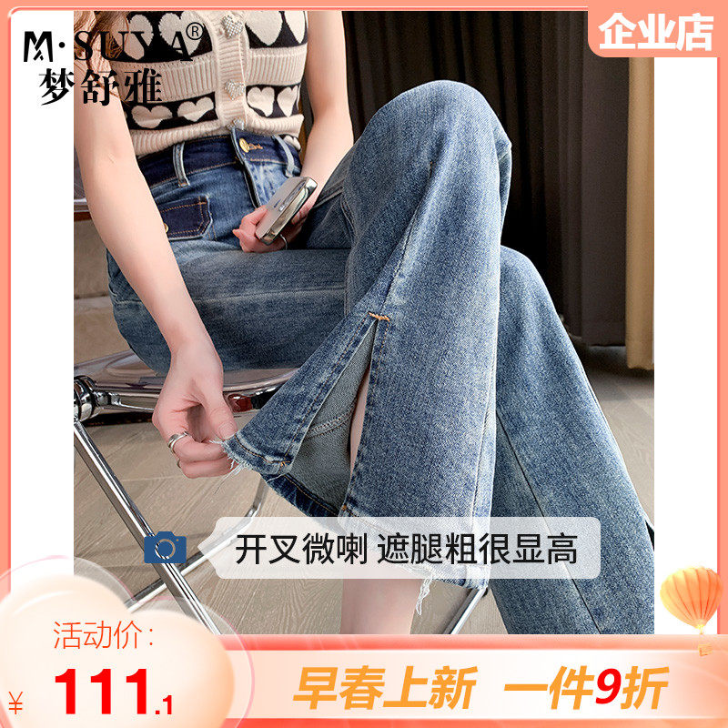 梦舒雅喇叭牛仔裤女2023年春新款时尚潮流高腰显瘦开叉微喇裤长裤