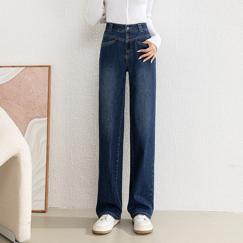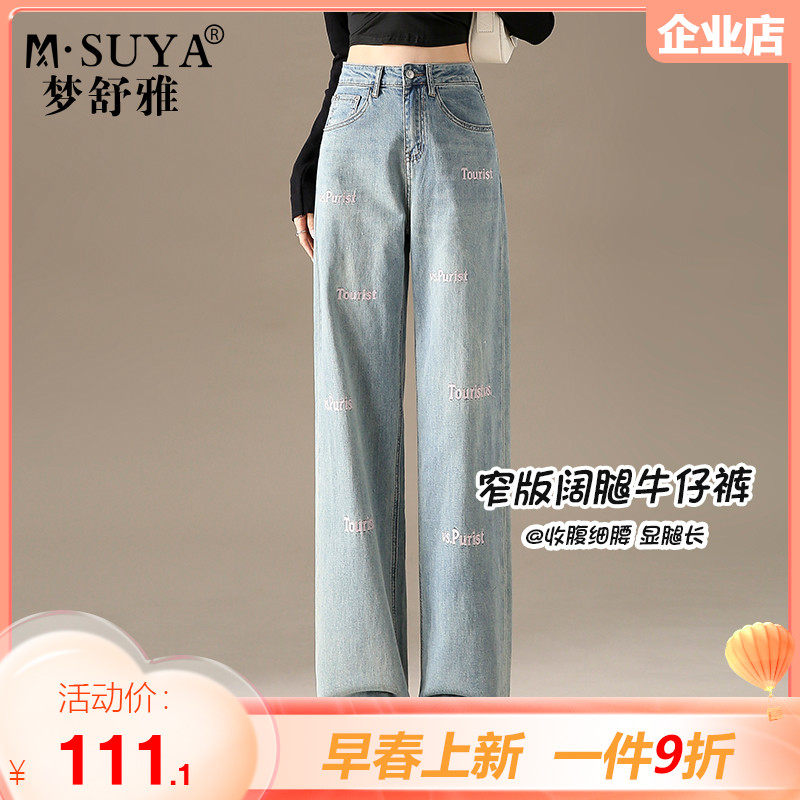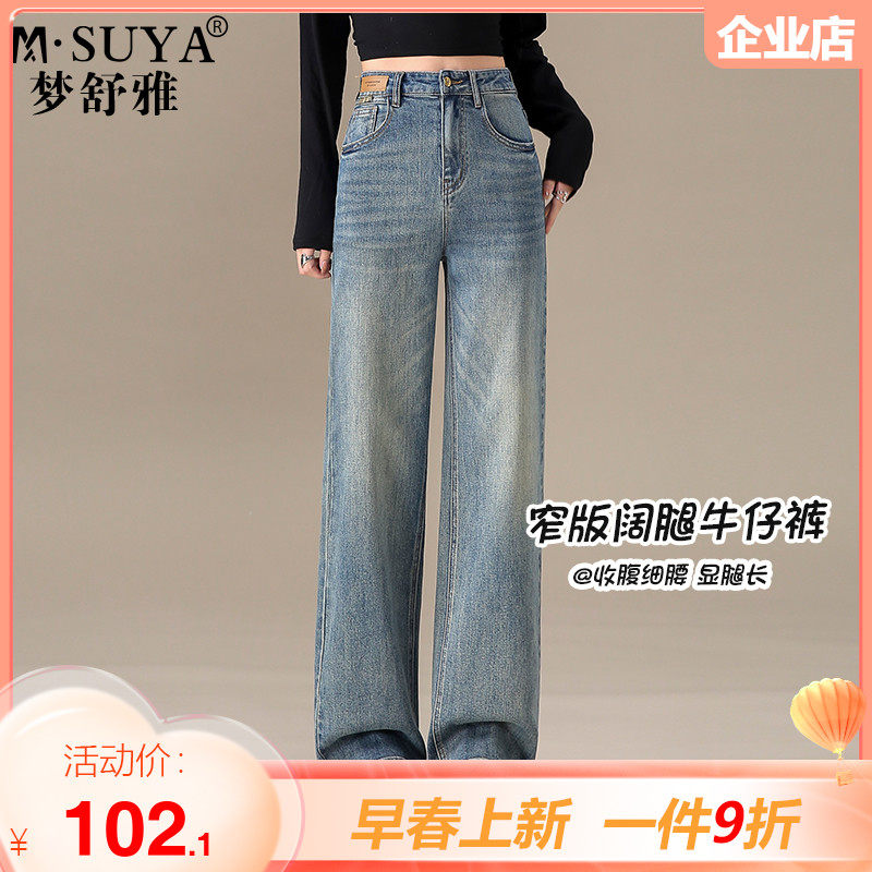 梦舒雅窄版阔腿牛仔裤女春秋新款高腰宽松显瘦垂感直筒拖地长裤子