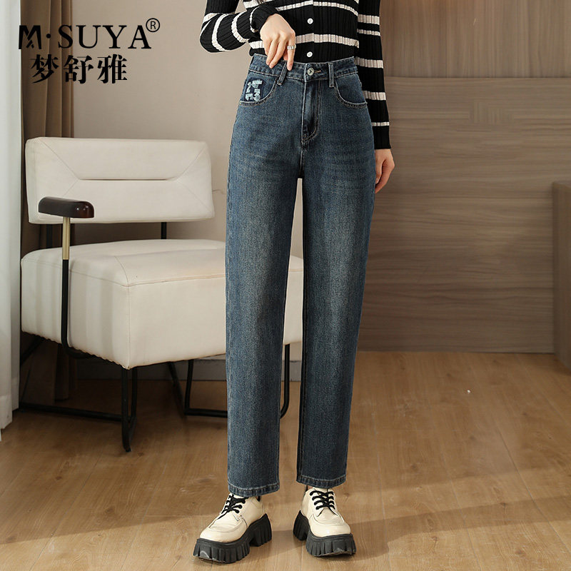 梦舒雅女裤2023秋冬19589322新品显瘦大尺码加绒加厚直筒牛仔椎板