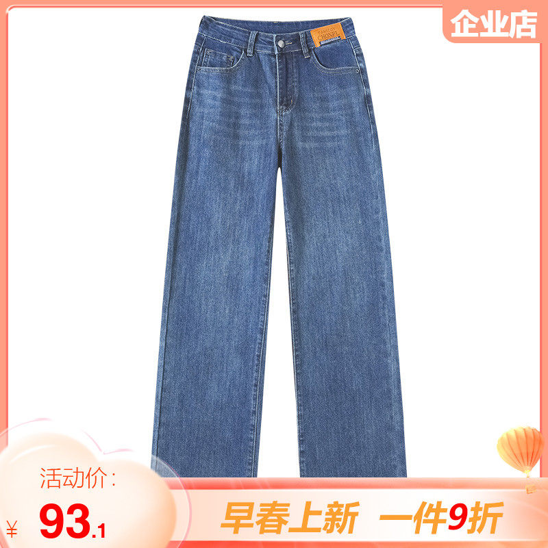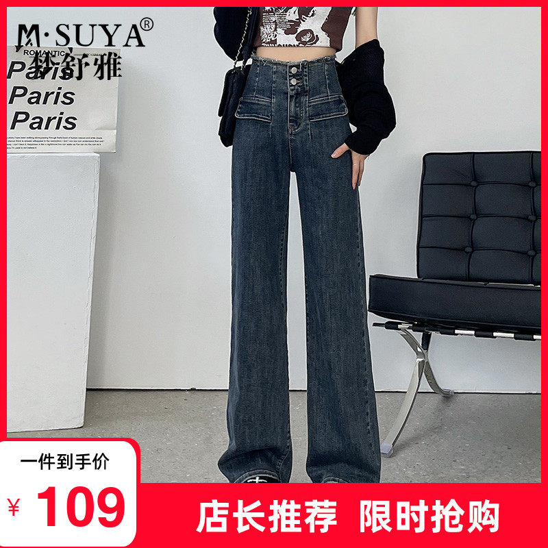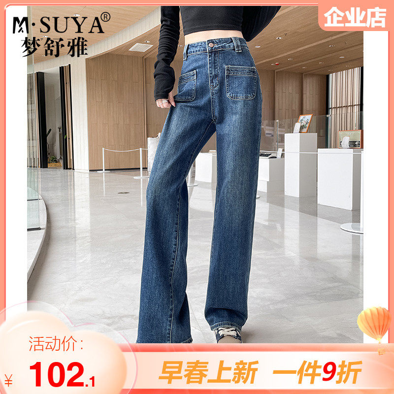 梦舒雅阔腿牛仔裤女2023新款春秋窄版高腰宽松休闲垂感直筒牛仔蓝