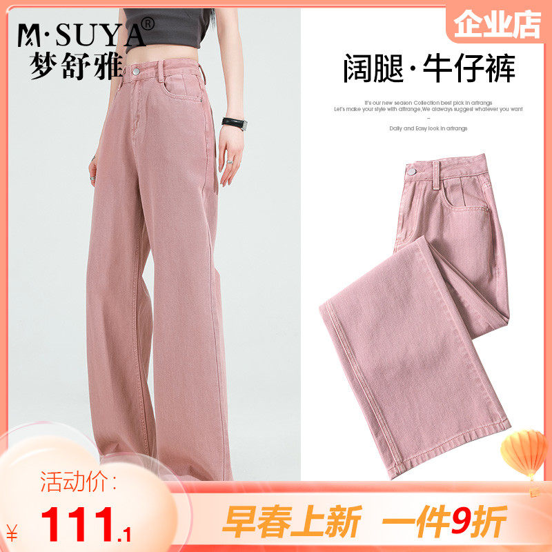 梦舒雅脏粉色高腰阔腿牛仔裤女2024年新款宽松显瘦小个子拖地长裤
