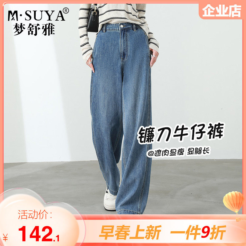 梦舒雅高腰镰刀牛仔裤女2024年春秋新款宽松显瘦垂感直筒拖地长裤