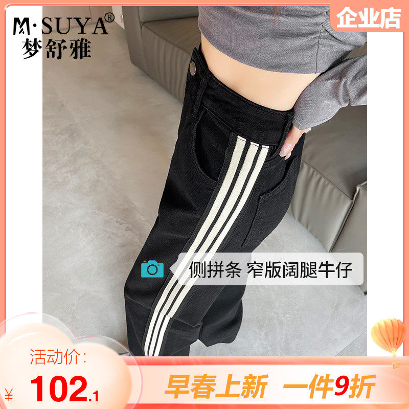 梦舒雅烟管裤女黑色春秋2023年新款小个子高腰宽松显瘦牛仔直筒裤
