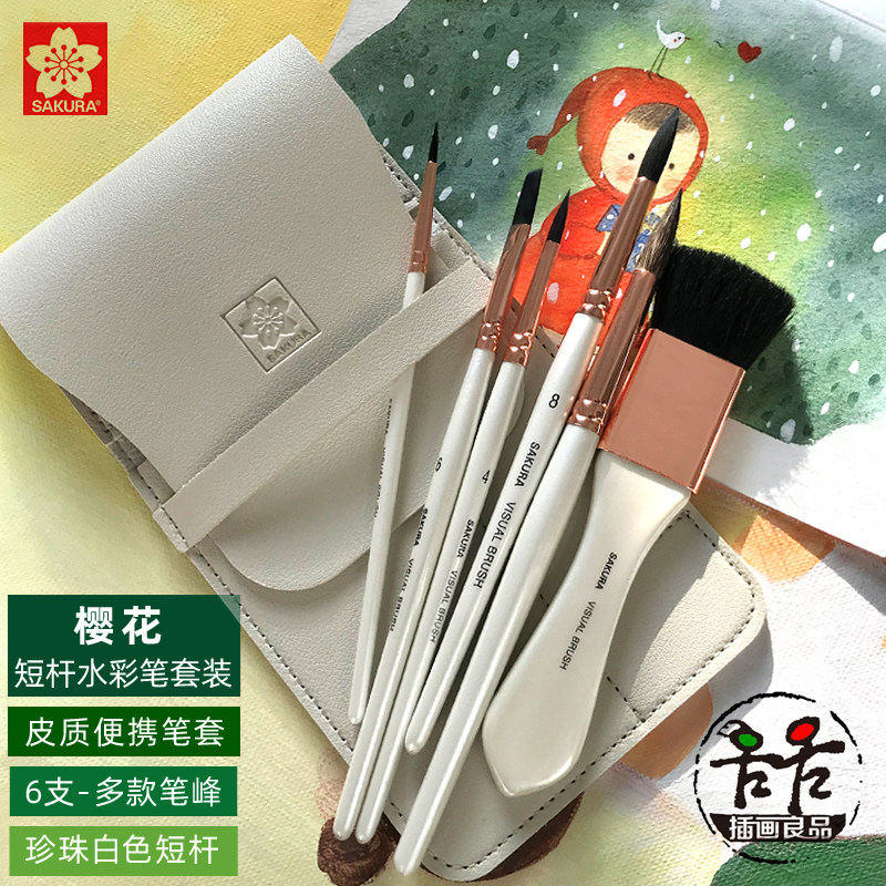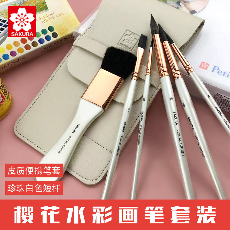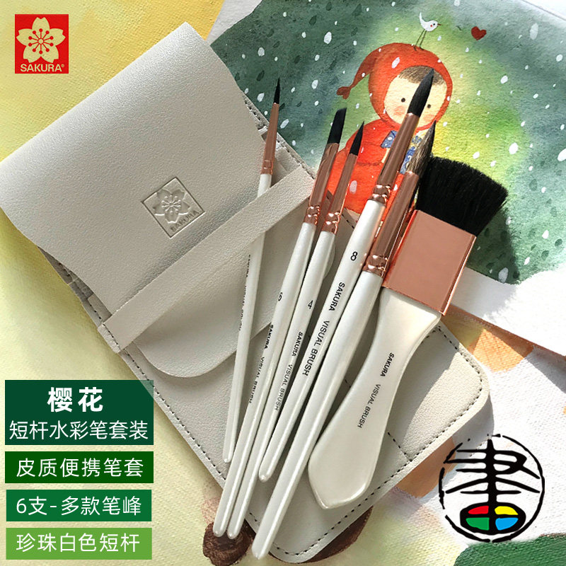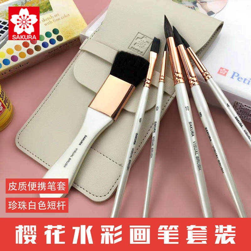 樱花便携水彩笔6支套装短杆勾线笔刷子平笔上色笔写生皮质笔袋套装水彩水粉笔毛笔