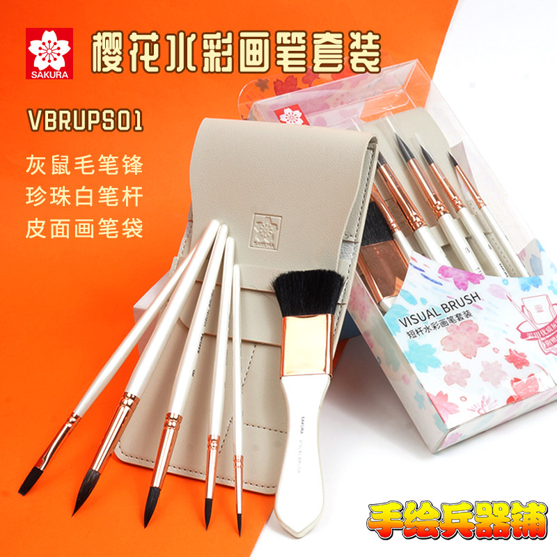 日本SAKURA樱花水彩画笔套装圆头平头组合珍珠白短杆水粉水彩笔勾线细节便携式旅行布包画笔VBRUPS灰鼠毛