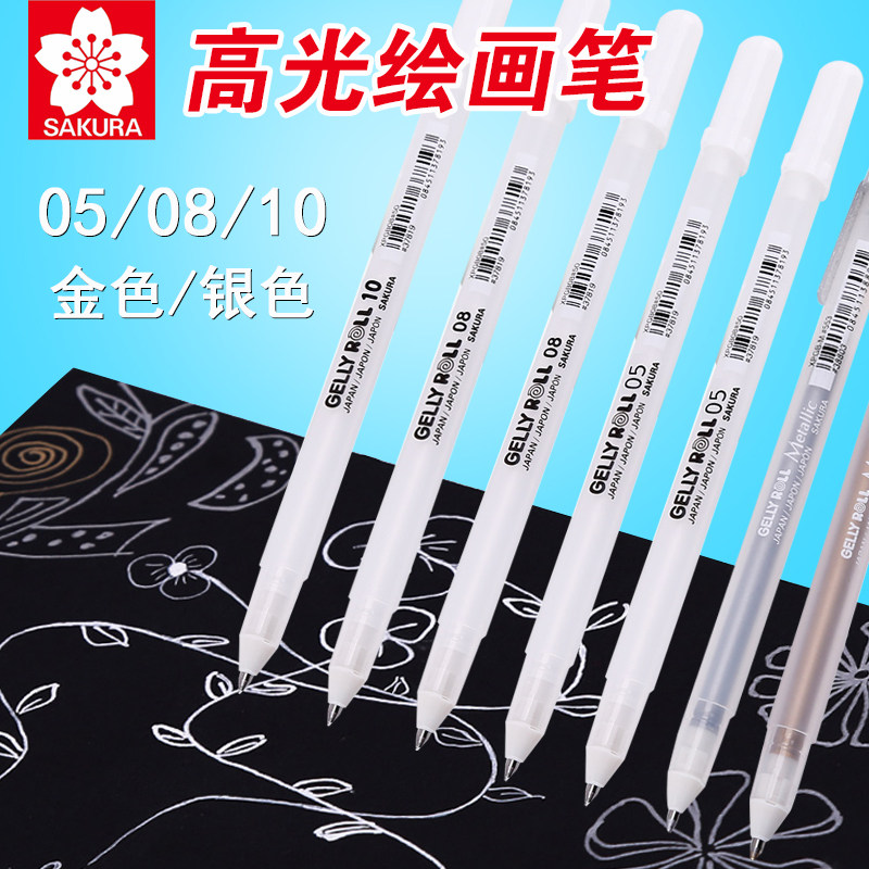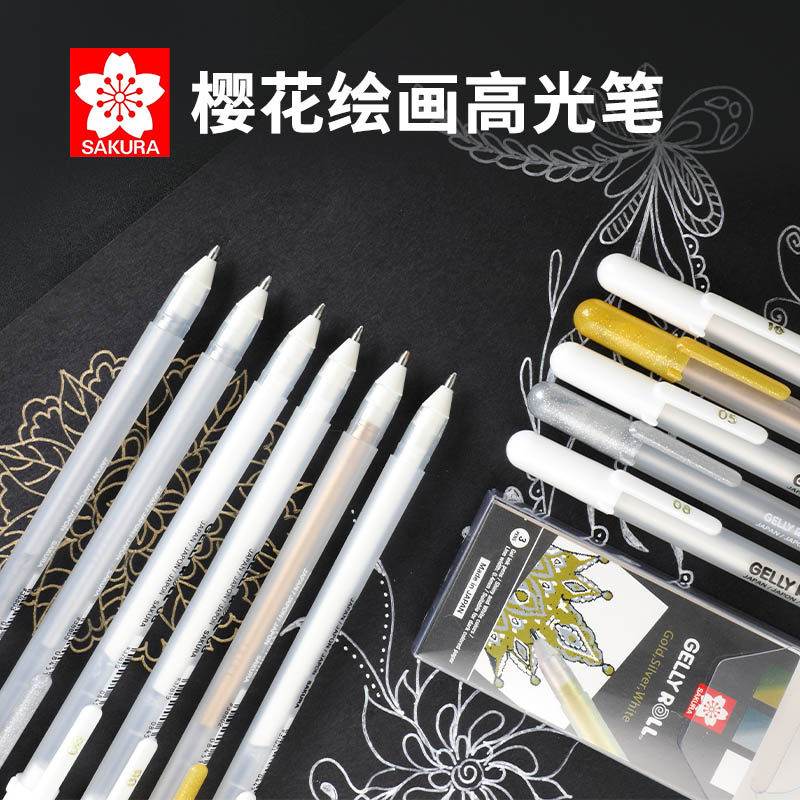日本SAKURA/樱花高光笔套装学生手绘高光金色画画美术专用0.5/0.8/1.0黑底写白色笔水彩留白勾线笔绘画笔学生