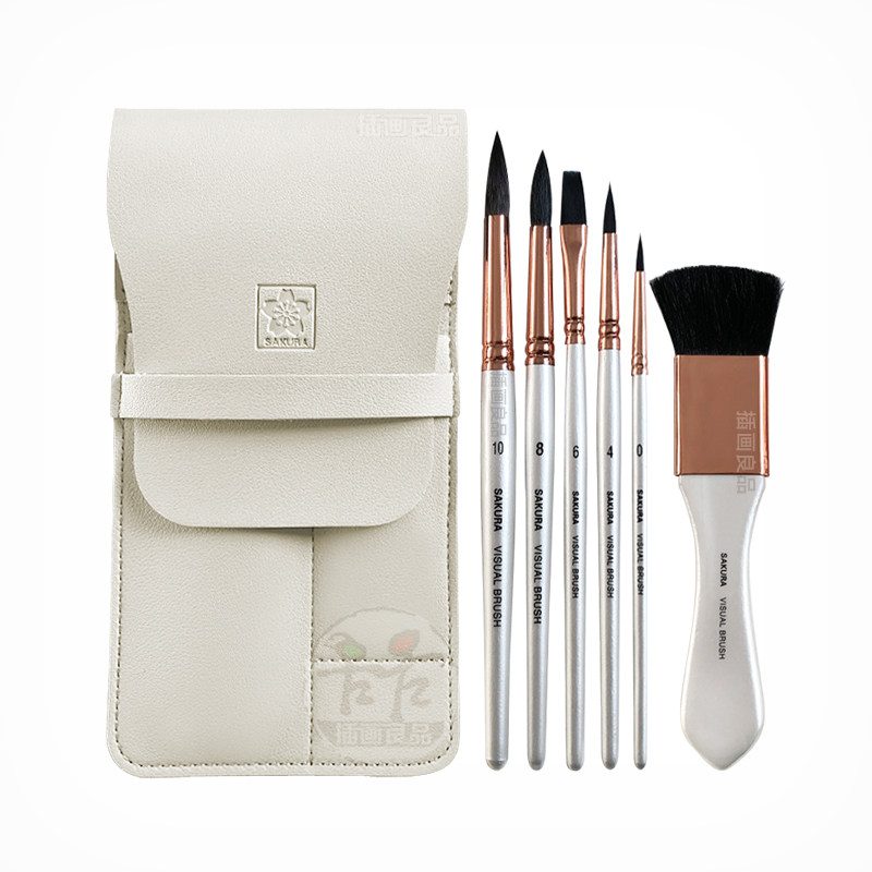 樱花便携水彩笔6支套装短杆勾线笔刷子平笔上色笔写生皮质笔袋套装水彩水粉笔毛笔