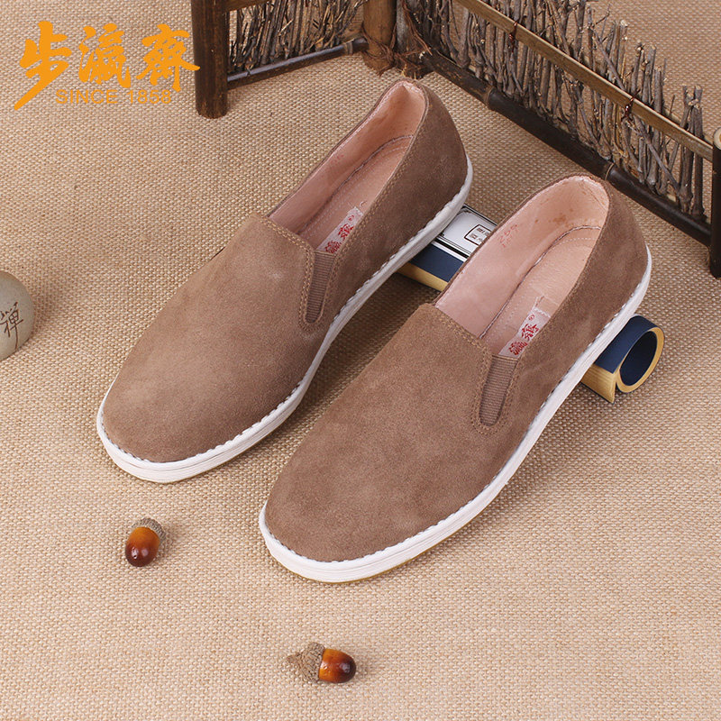 步瀛斋老北京布鞋棕色反绒牛皮鞋中老年千层底布鞋一脚蹬懒人鞋