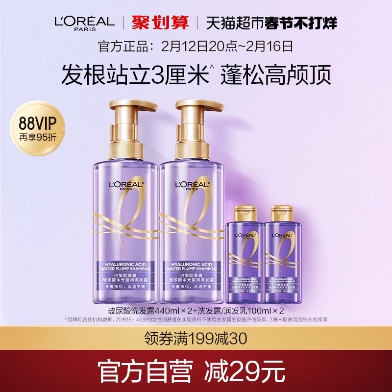 [春节不打烊]欧莱雅玻尿酸洗发水护发素控油蓬松柔顺去油无硅油女
