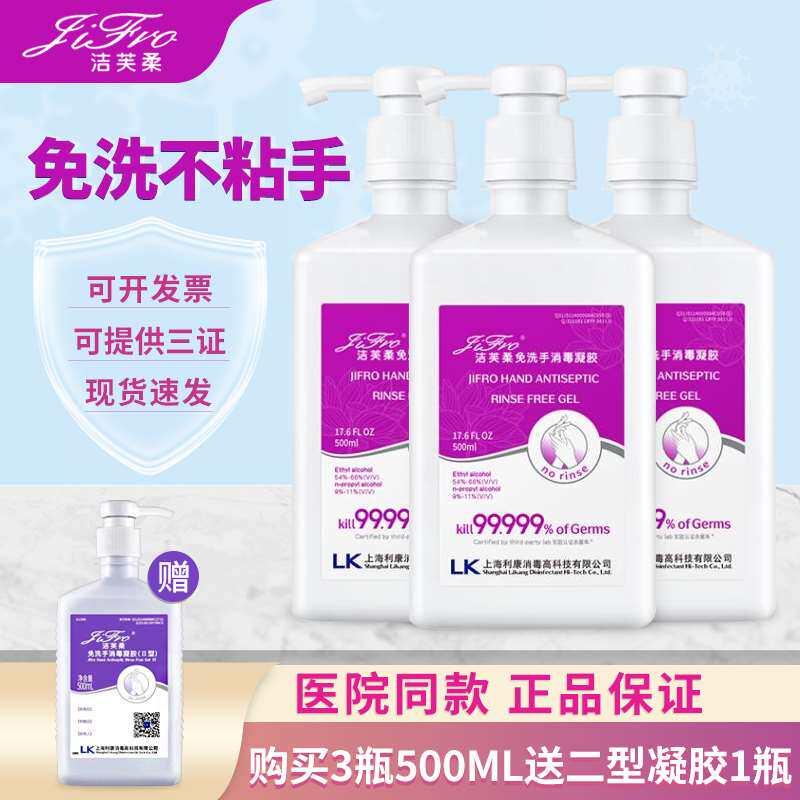 洁芙柔免洗洗手液消毒凝胶大瓶装500ml3瓶家用杀菌酒精免洗消毒液