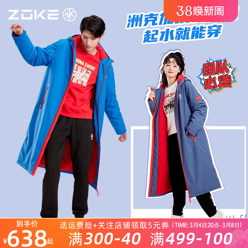 zoke洲克加绒长款棉服成人青少年运动训练游泳情侣款加厚保暖棉衣