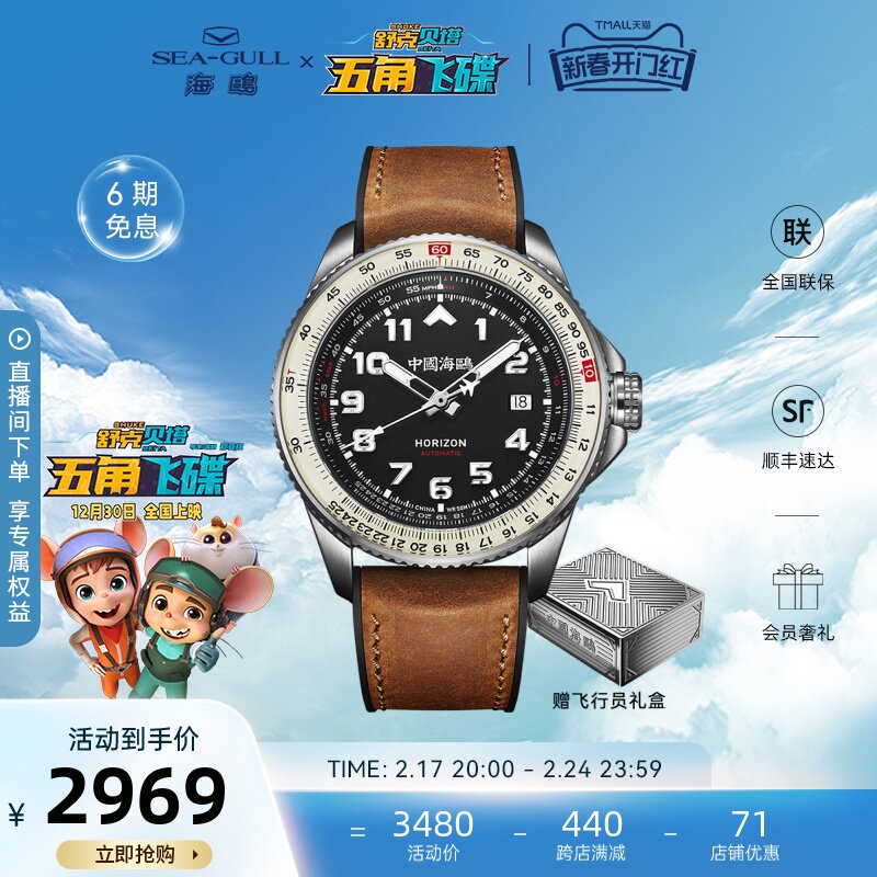 新品 海鸥手表男款双时区机械表男熊猫盘飞行员手表男士腕表6157