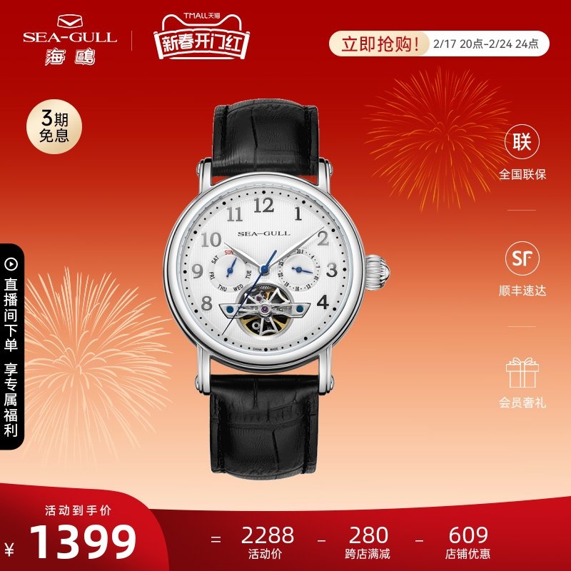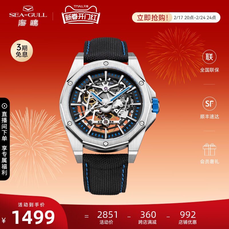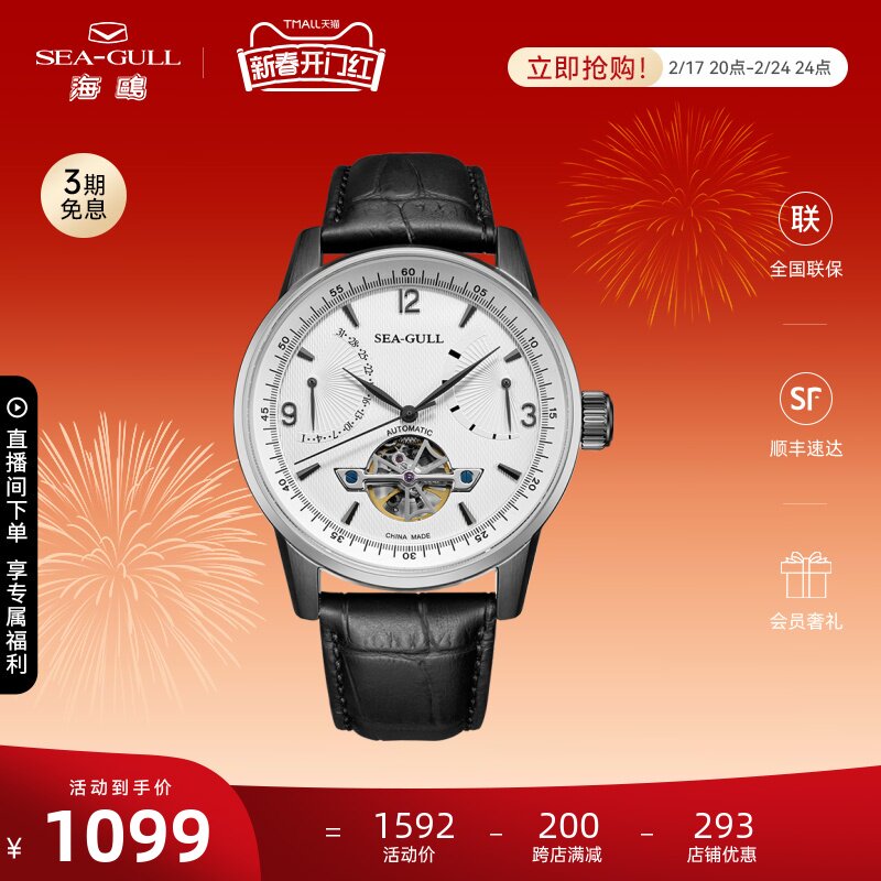 海鸥手表男款机械表镂空飞轮表男士手表多功能防水腕表男表1055
