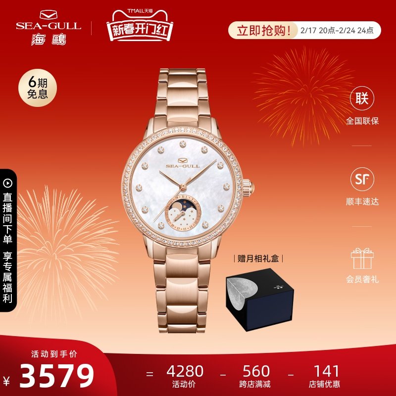 【新年礼物】海鸥手表女月相机械表轻奢复古贝母盘女腕表1136L