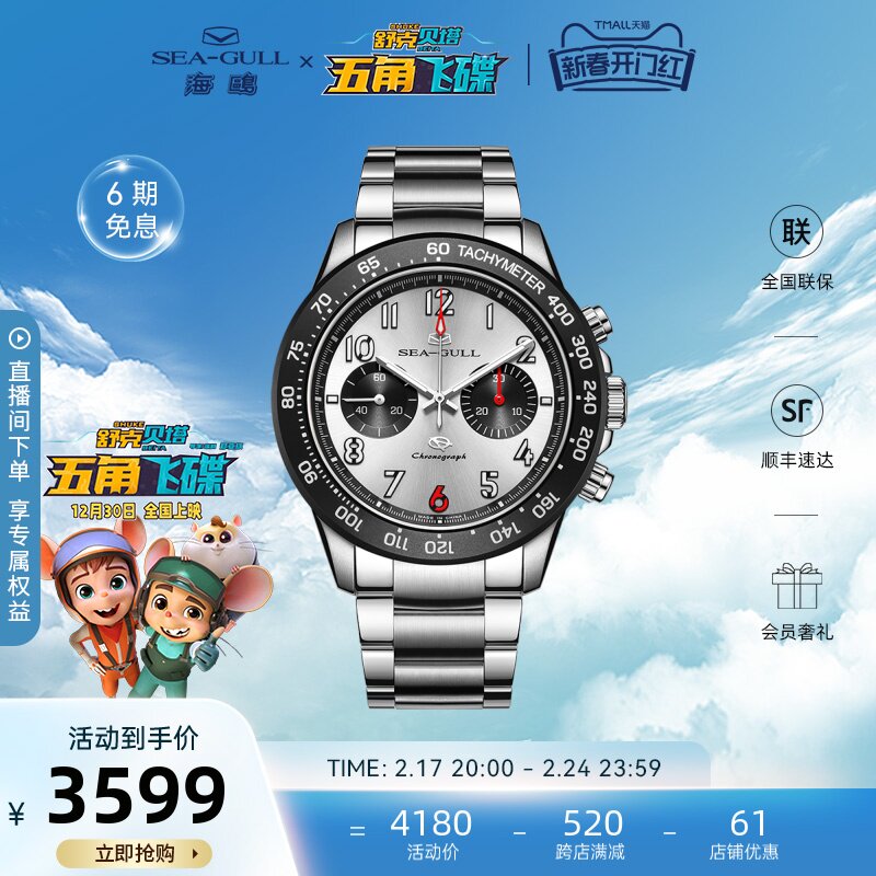 海鸥手表男士机械表熊猫眼飞行员计时码表男表-红6战机6156