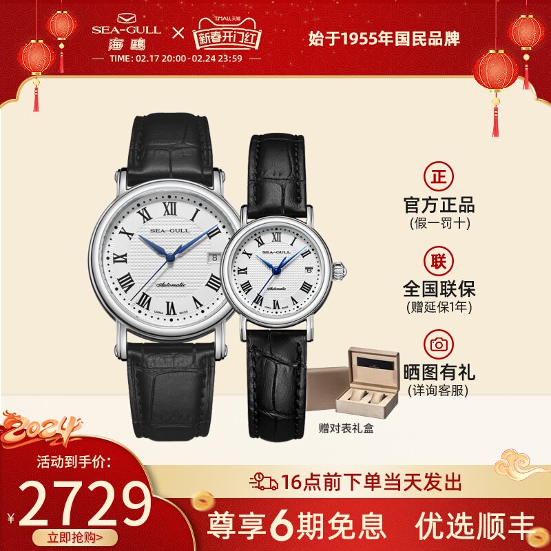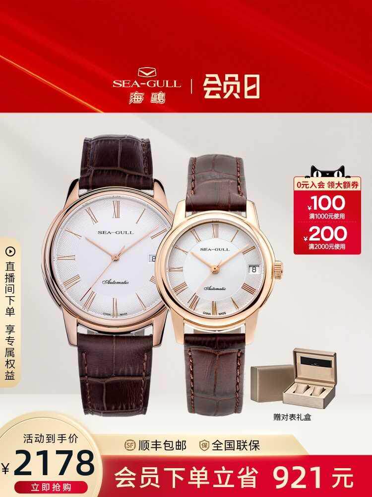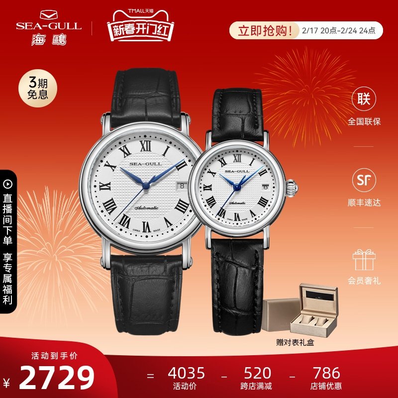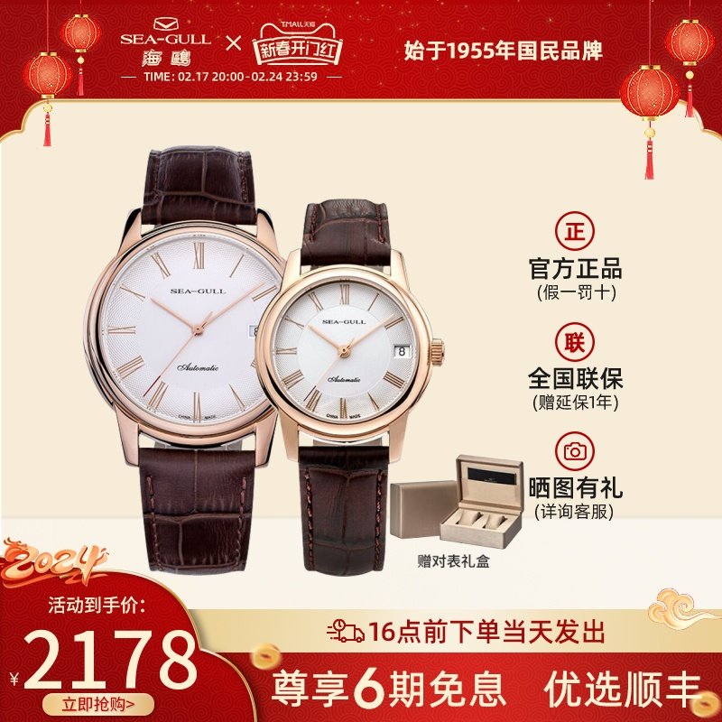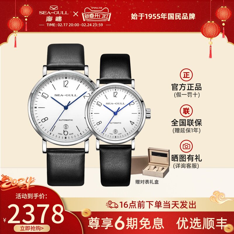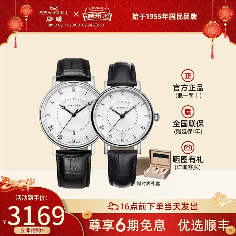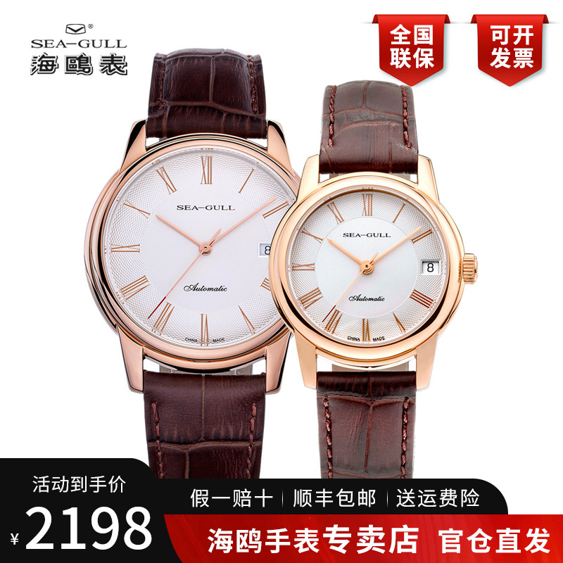 海鸥手表商务情侣对表自动机械表皮带日历腕表519.405新年礼