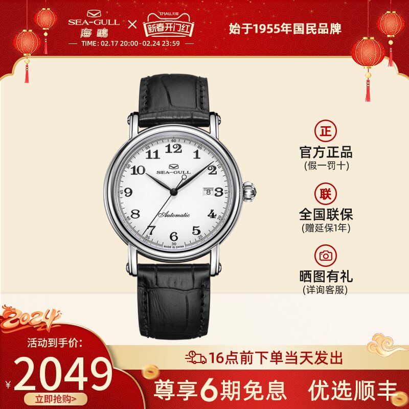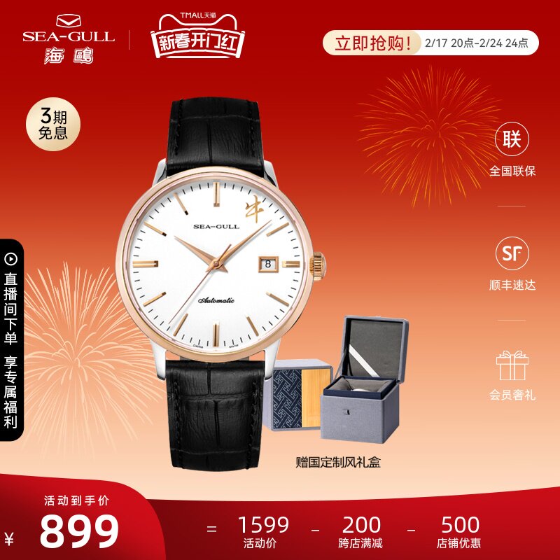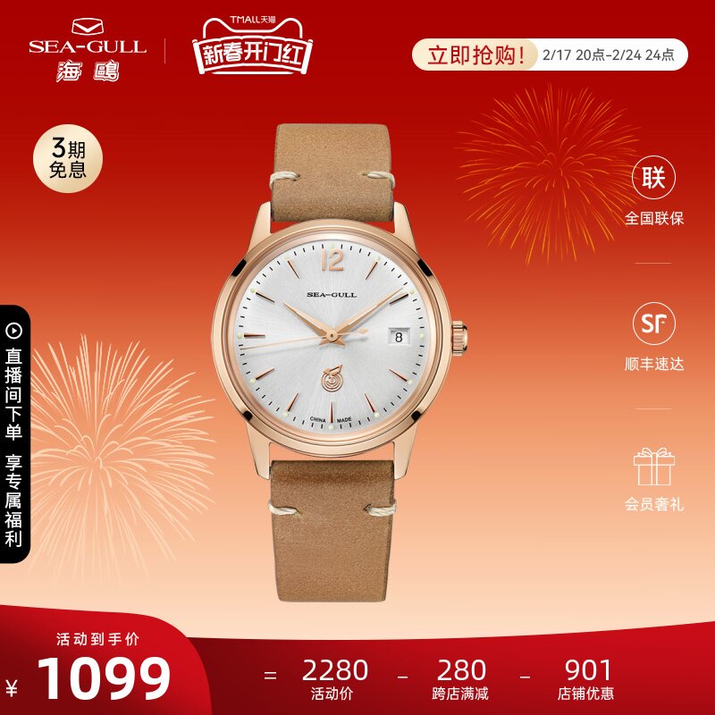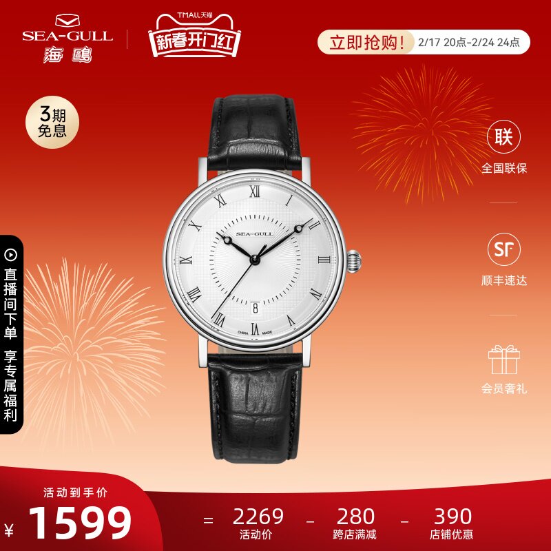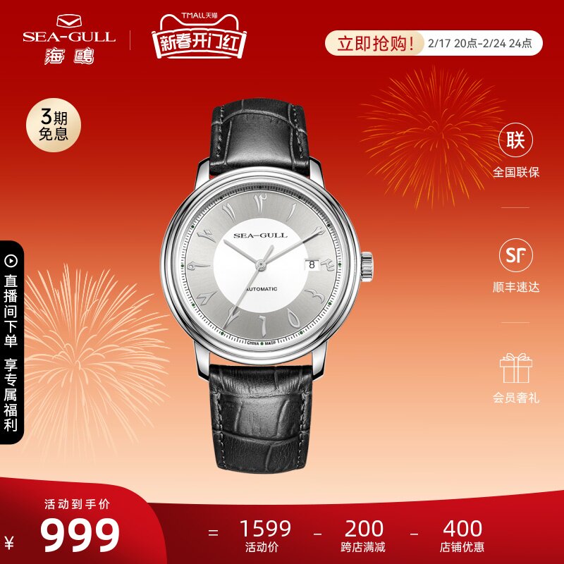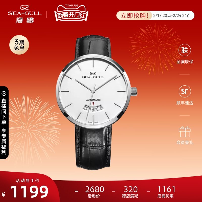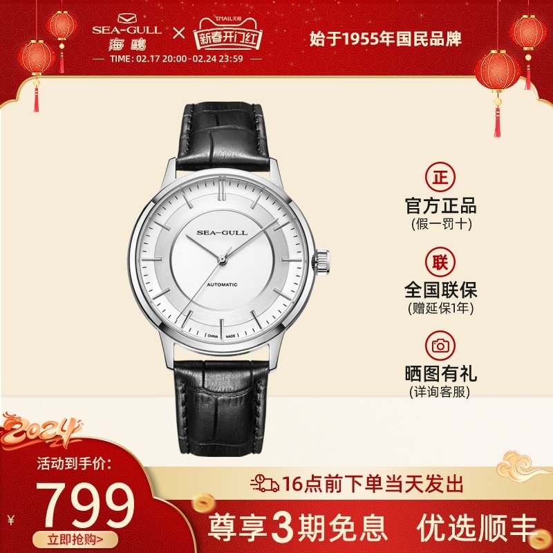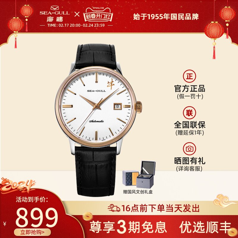 海鸥手表商务情侣对表自动机械表皮带日历腕表519.405新年礼