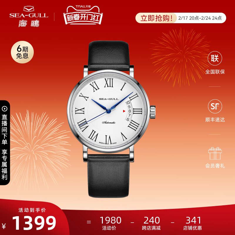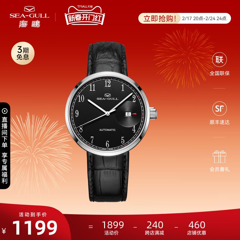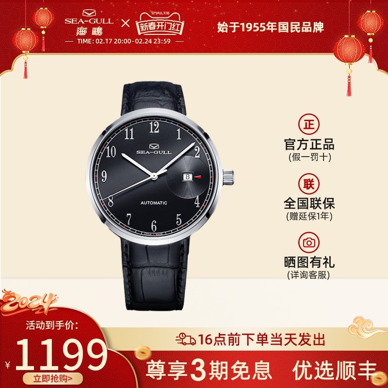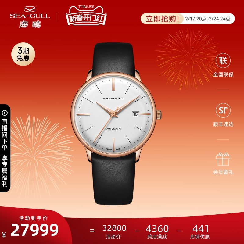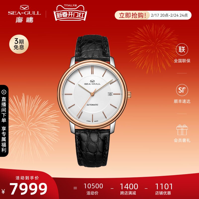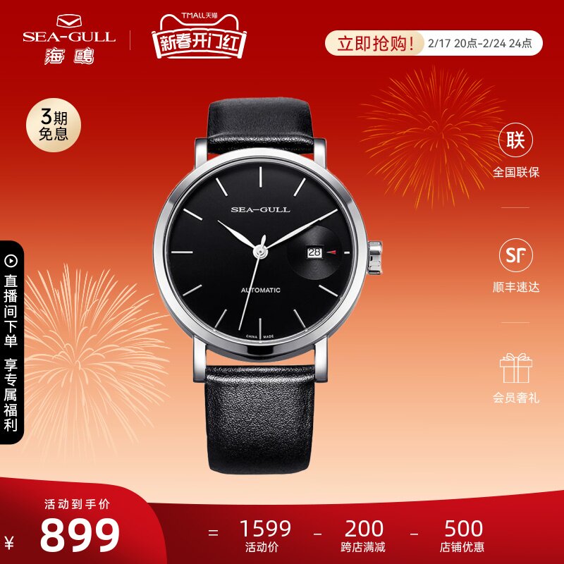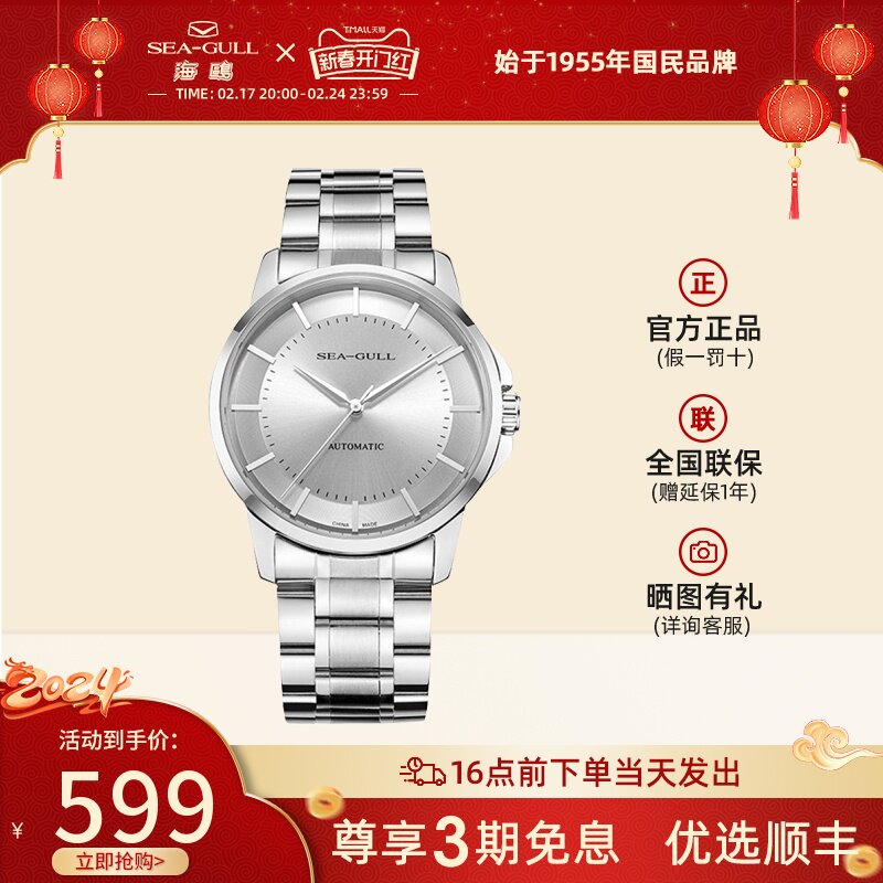 海鸥手表商务情侣对表自动机械表皮带日历腕表519.405新年礼