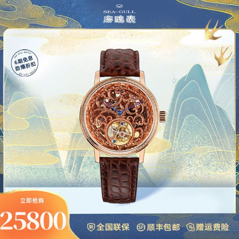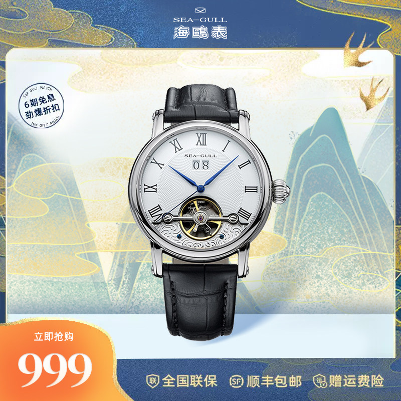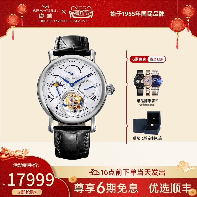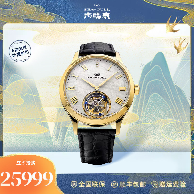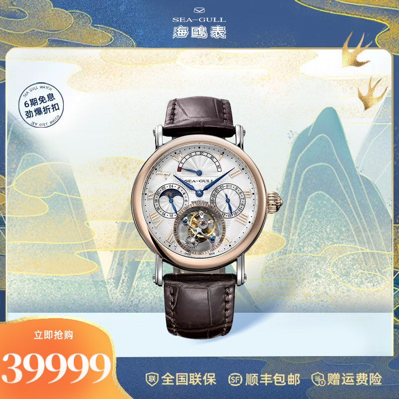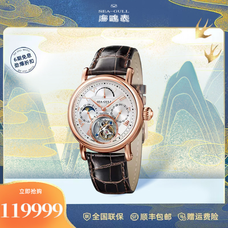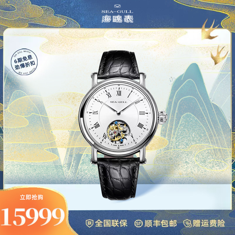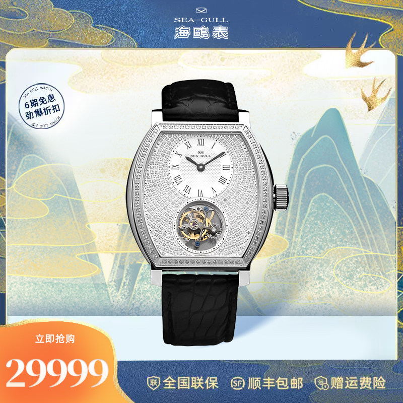 海鸥镶钻鳄鱼皮陀飞轮高档商务男士腕表经典皮带手表748.11.7039V