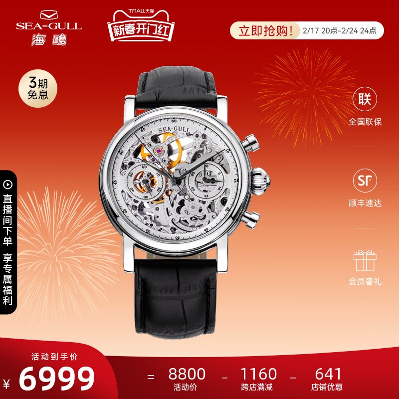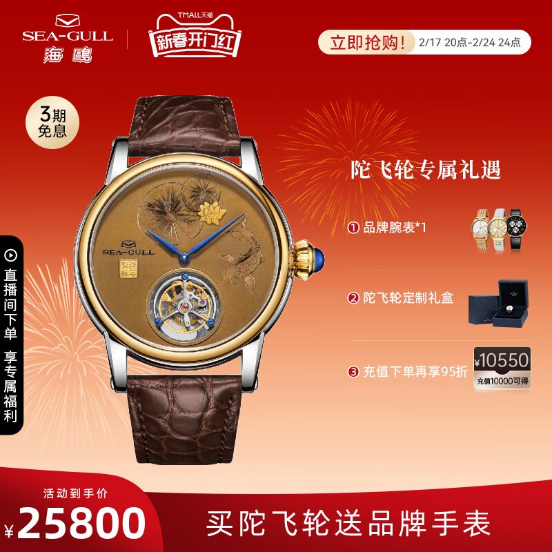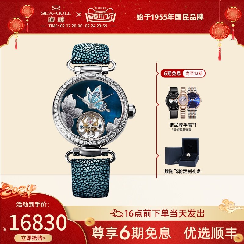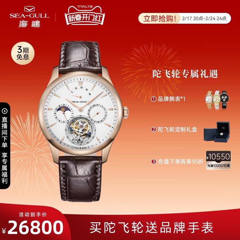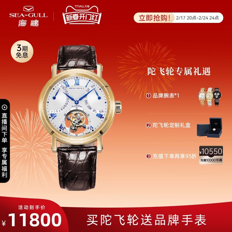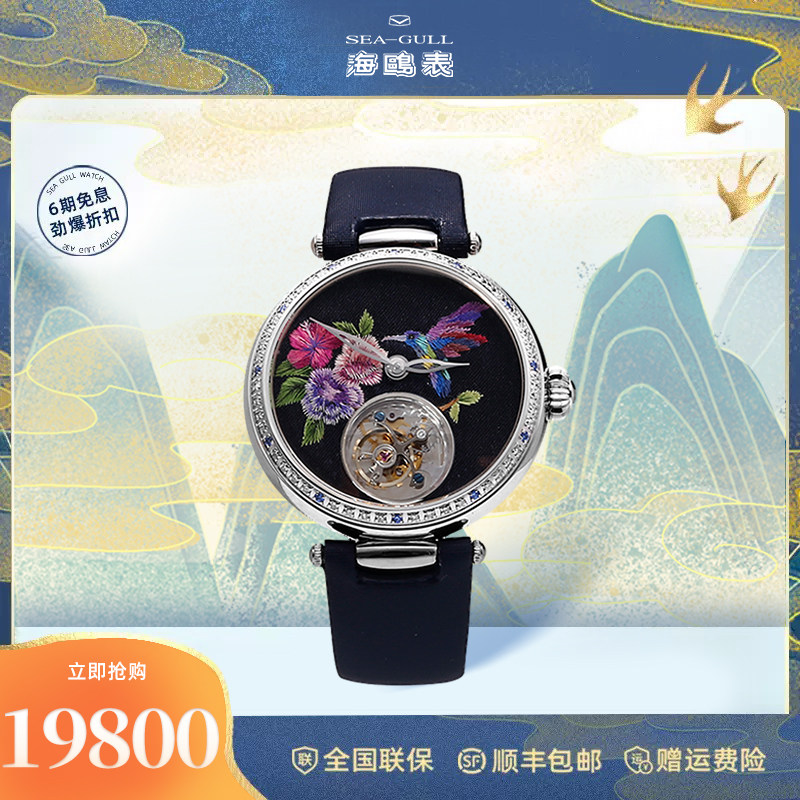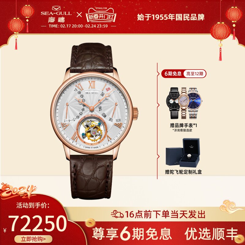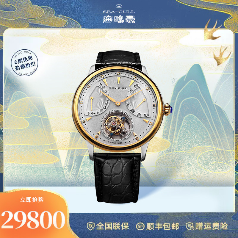海鸥镶钻鳄鱼皮陀飞轮高档商务男士腕表经典皮带手表748.11.7039V