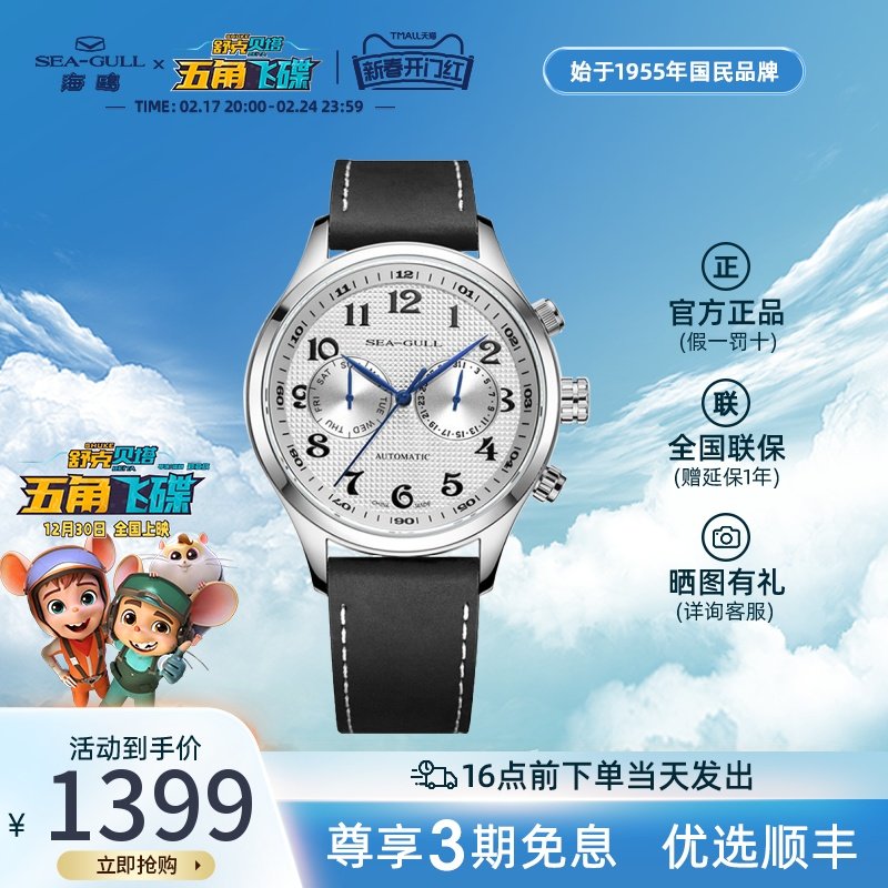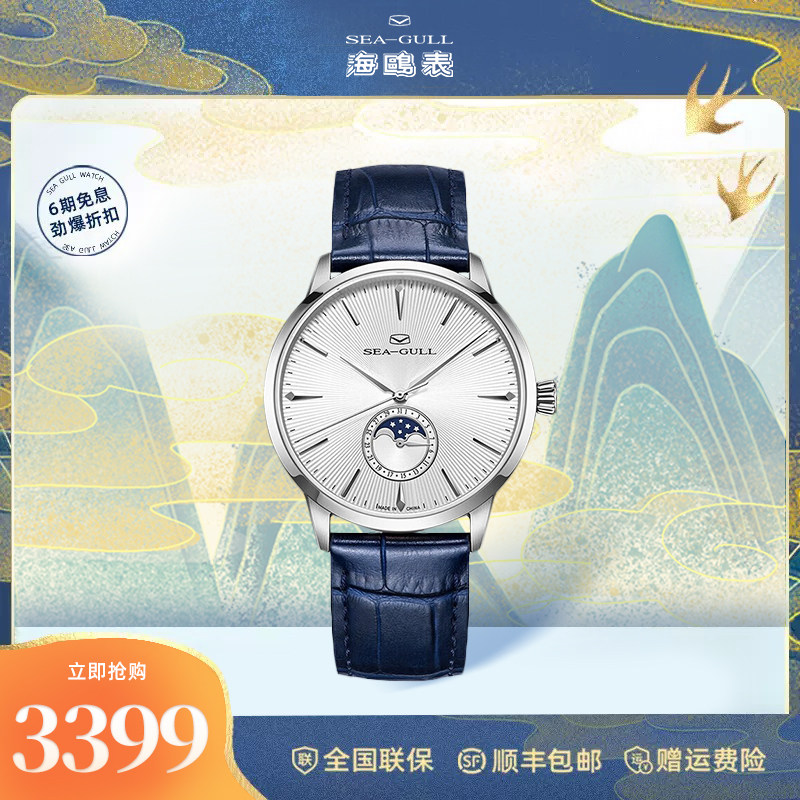 官方正品海鸥手表男士多功能月相机械表商务休闲纤薄皮带腕表1135