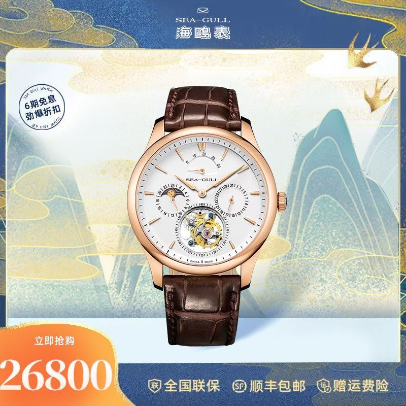 正品海鸥手表男士18K金手动陀飞轮金表多功能皮带腕表ST8007G