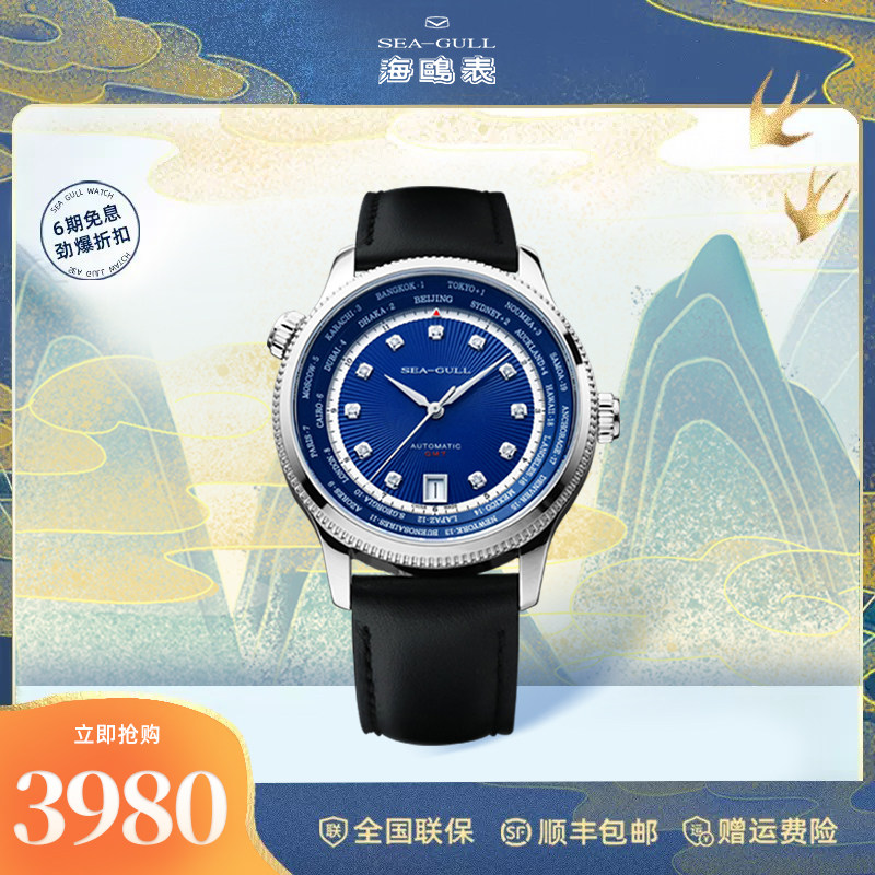 正品海鸥手表男士商务休闲皮带双时区全自动机械表男表巨匠6063潮