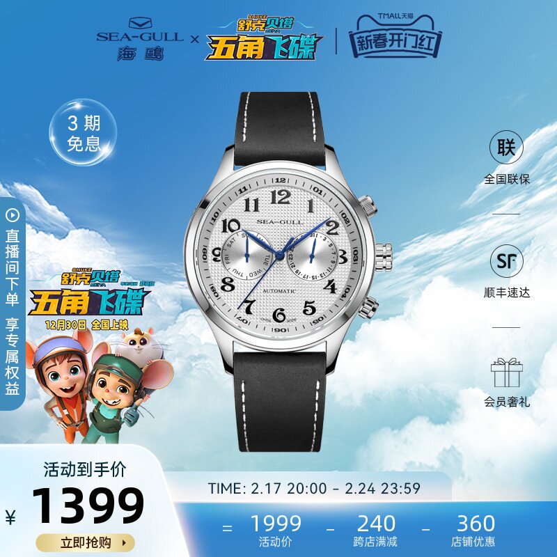 Seagull海鸥手表男士多功能商务休闲运动男表皮带机械世界时腕表