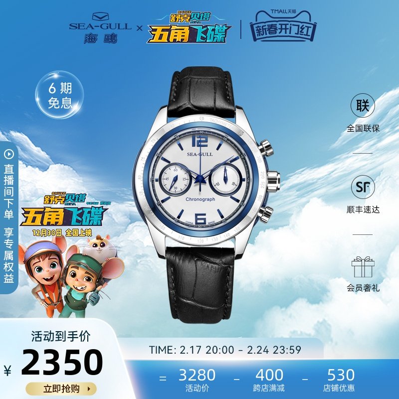 Seagull海鸥手表蝴蝶扣镂空皮带计时码表男表M190SK巨匠