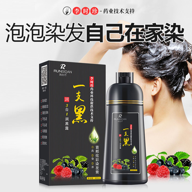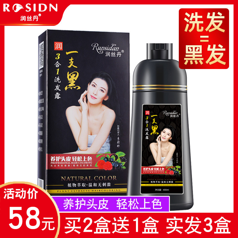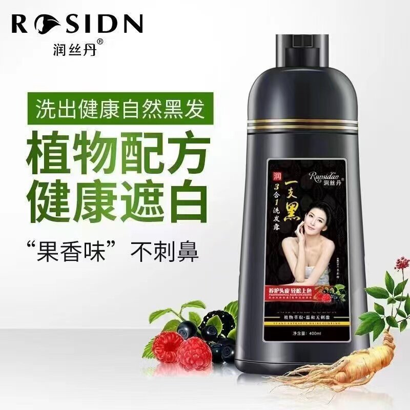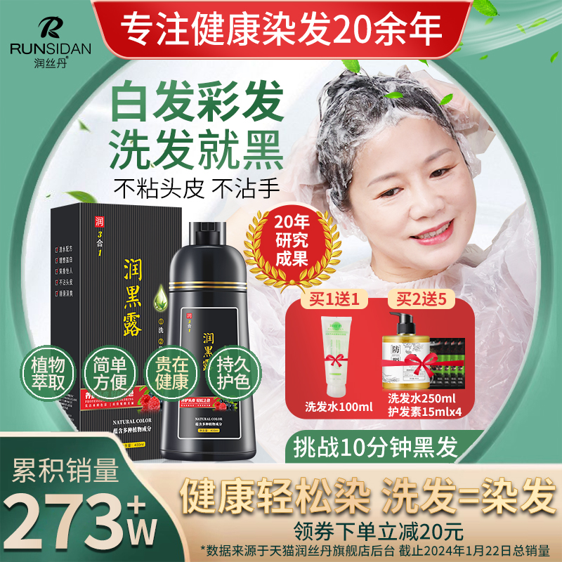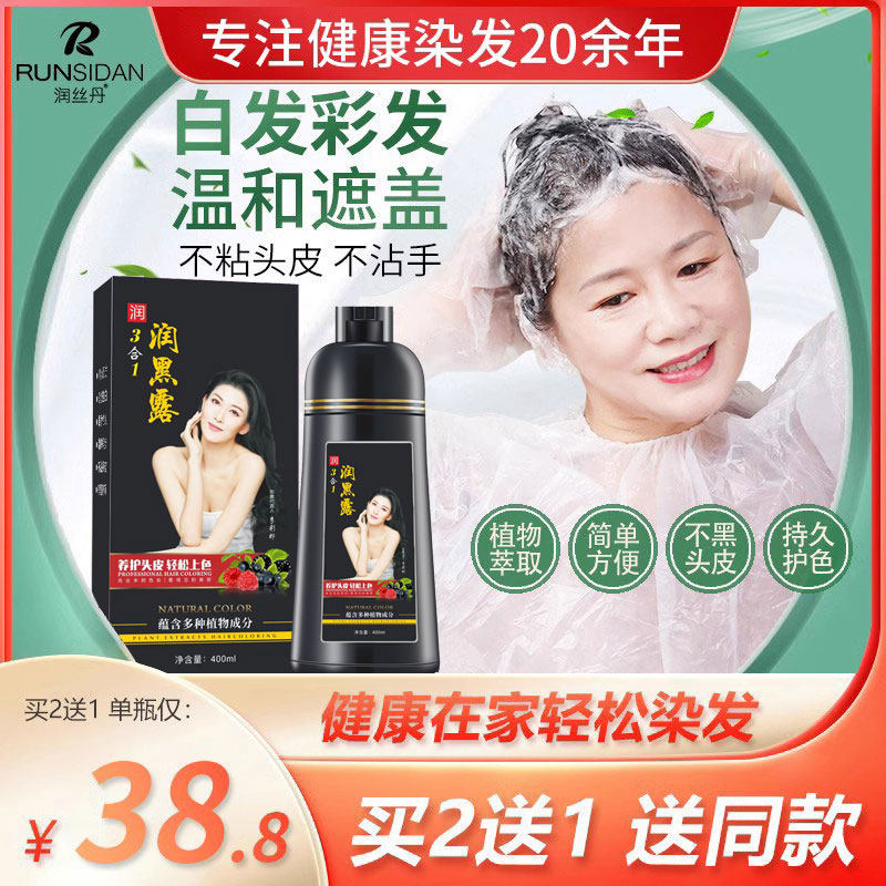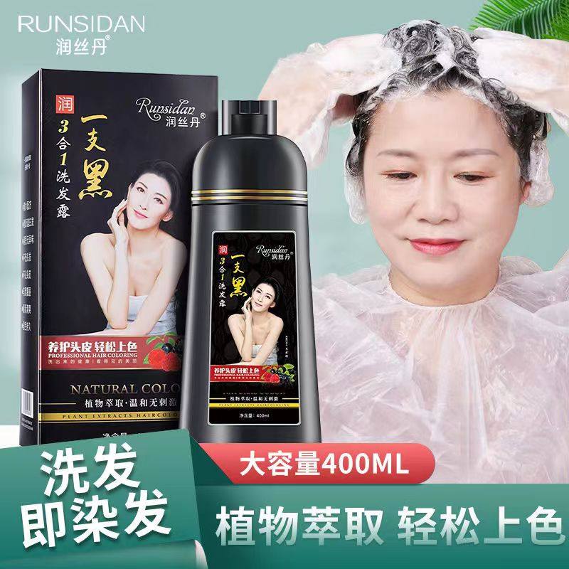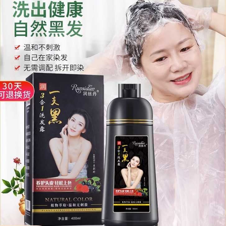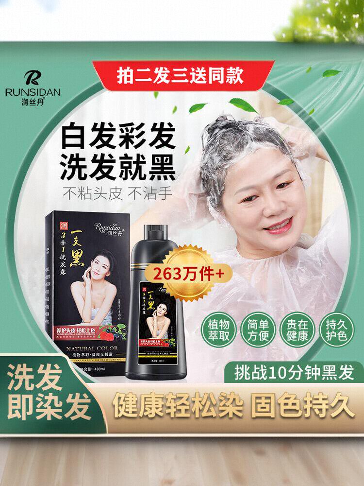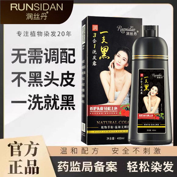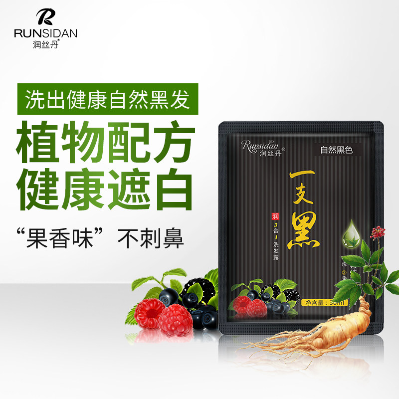 正品润丝丹一支黑染发剂植物黑发盖白家染洗发水染发膏健康三合一
