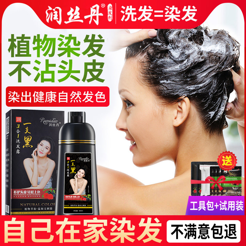 润丝丹植物无刺激一洗黑遮白发染发剂洗发水自己在家染发纯膏