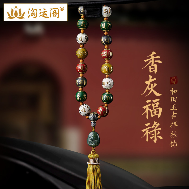 沉香木平安扣汽车挂件和田玉配珠六字真言后视镜车内流苏吊坠挂饰