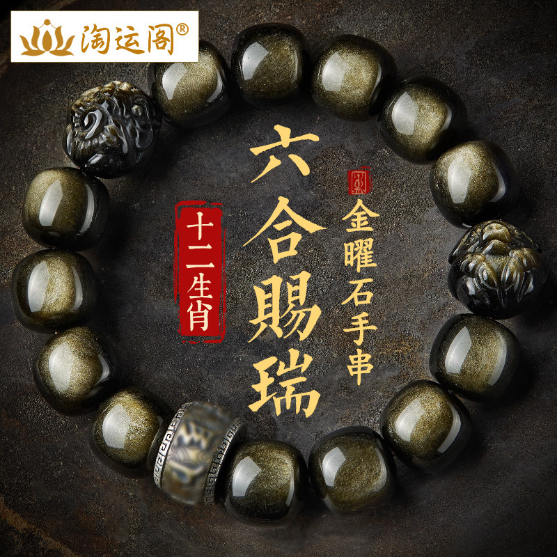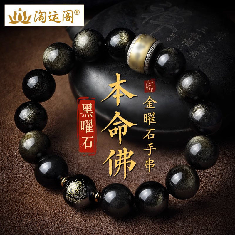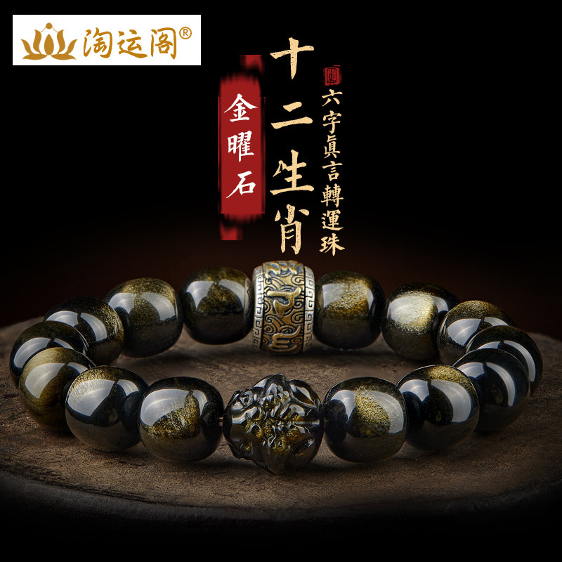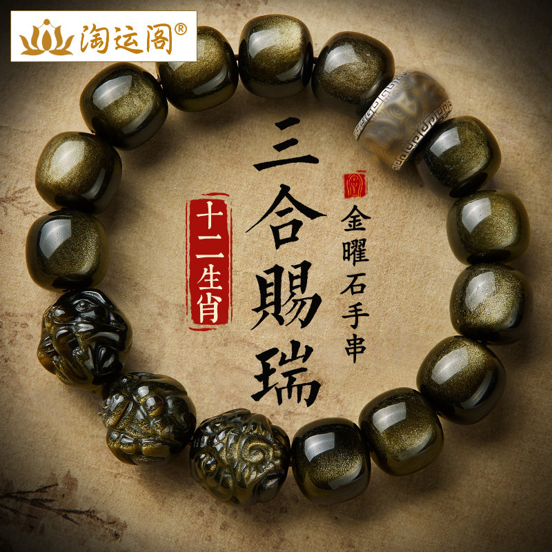 黑曜石手串男士三合十二生肖手链转运珠金曜石文玩佛珠送男生礼物