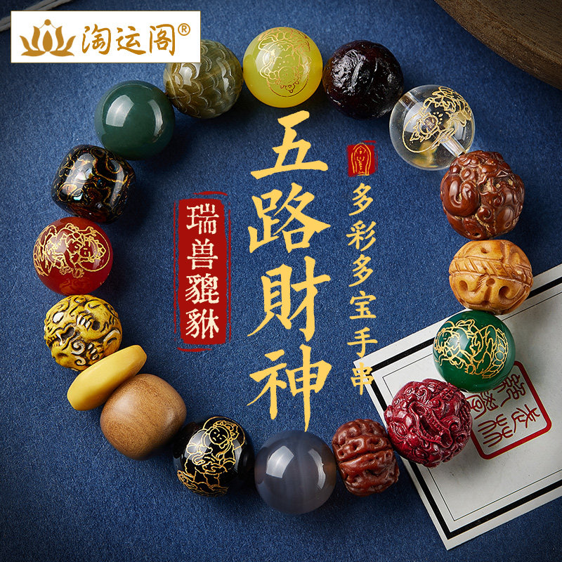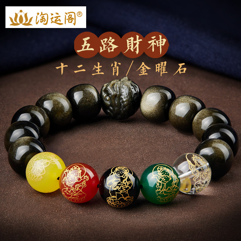 五路财神转运珠手链黑曜石手串金曜石十二生肖佛珠本命年五福临门