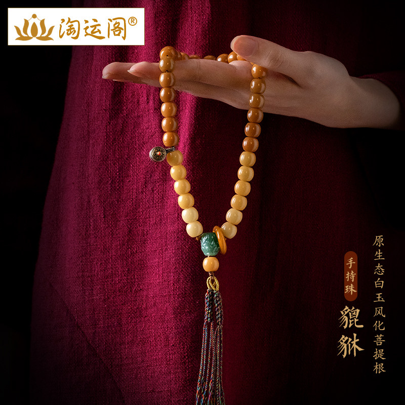 白玉渐变菩提根手持珠文玩手串女佛珠念珠和田玉貔貅转运珠男盘玩