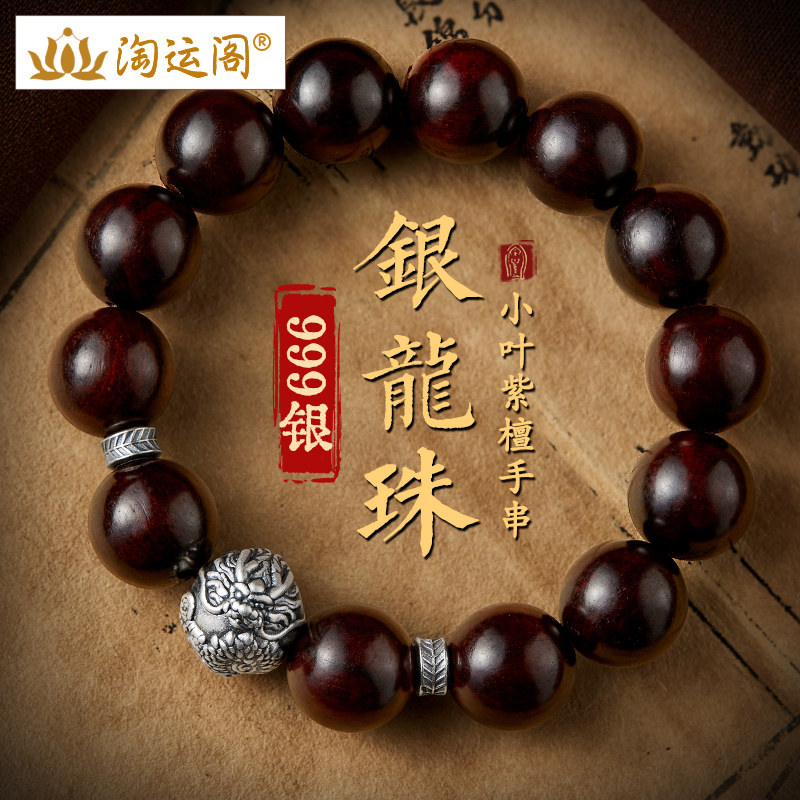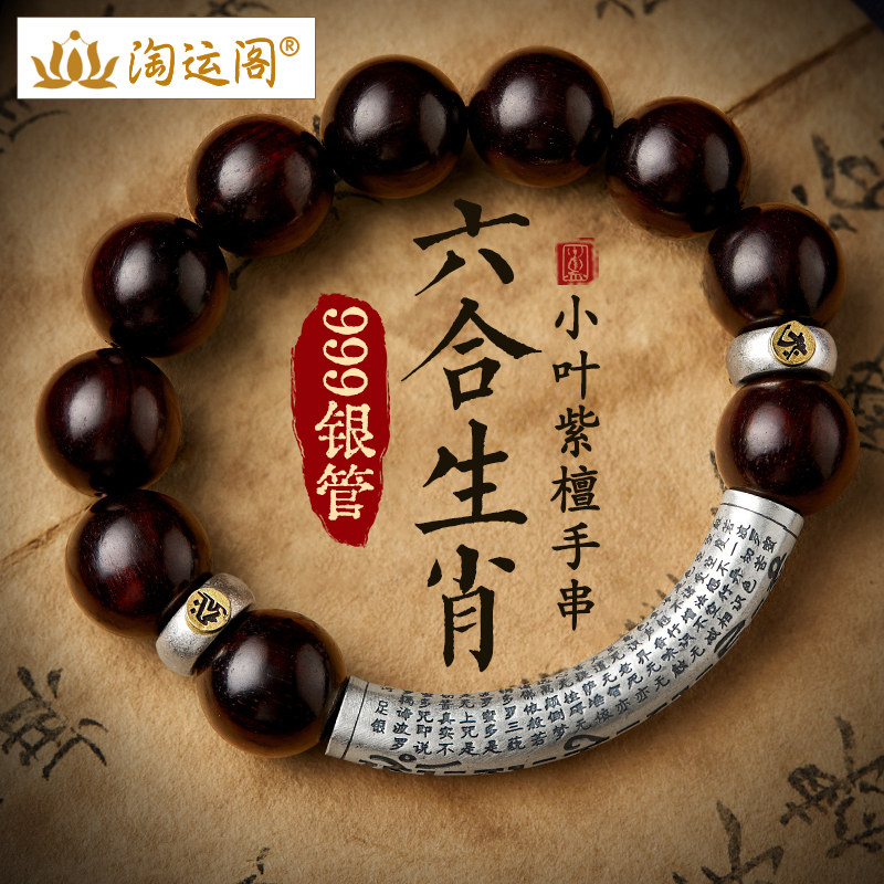 小叶紫檀手串男女文玩六合生肖手链999银六字真言心经手镯转运珠
