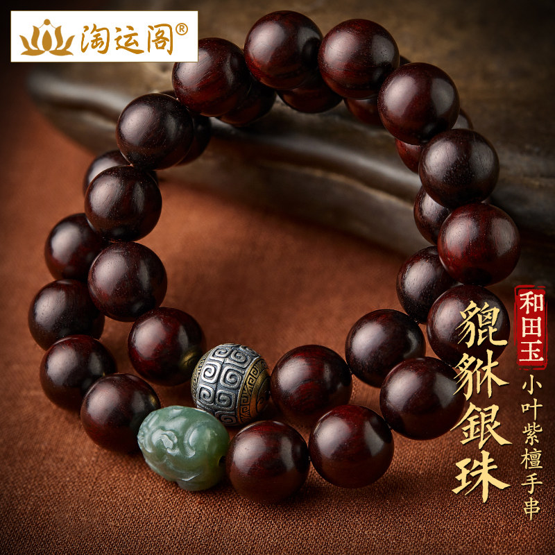 小叶紫檀手串多圈和田玉貔貅手链银回纹珠双圈佛珠念珠文玩手把件