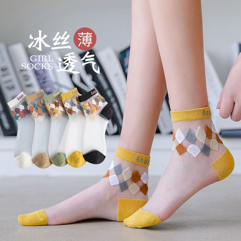 纯棉袜底短筒袜子女夏季薄款可爱日系中筒玻璃丝袜水晶冰丝袜夏天