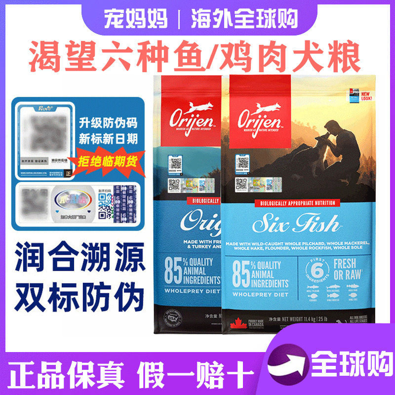 双标防伪Orijen加拿大渴望狗粮六种鱼柴犬幼犬成犬通用无谷粮2kg