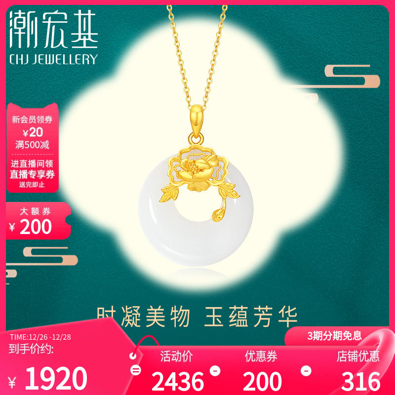 潮宏基颜如玉足金和田玉挂坠黄金吊坠牡丹国色金镶玉送妈妈