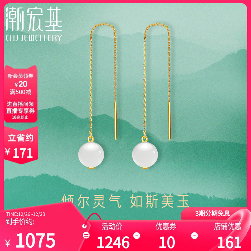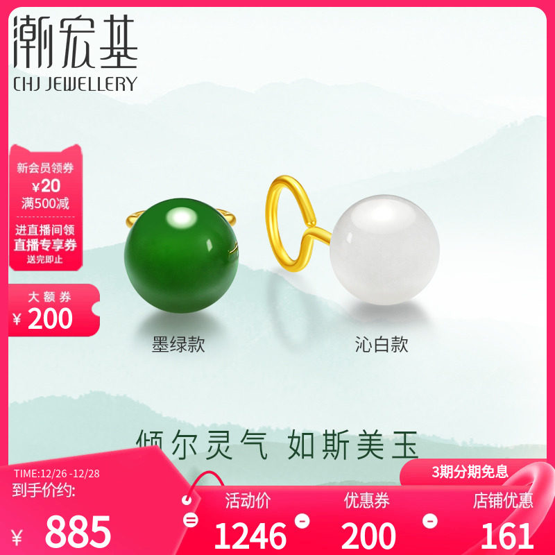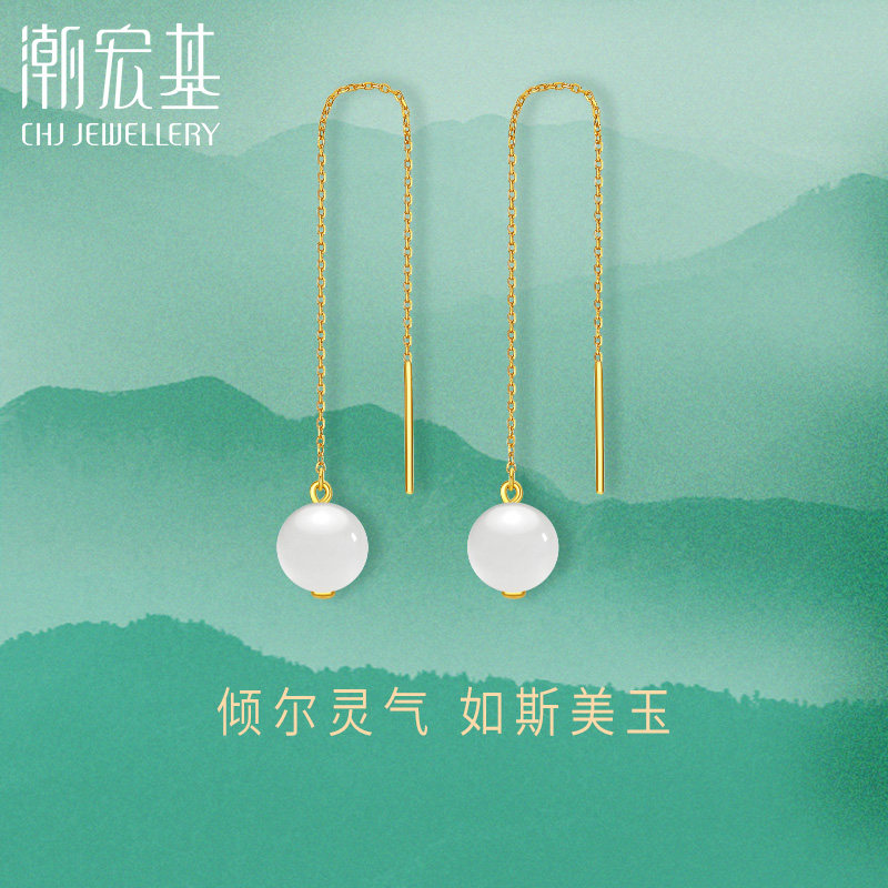 潮宏基倾玉足金和田玉耳钉耳线黄金耳饰金镶玉送妈妈