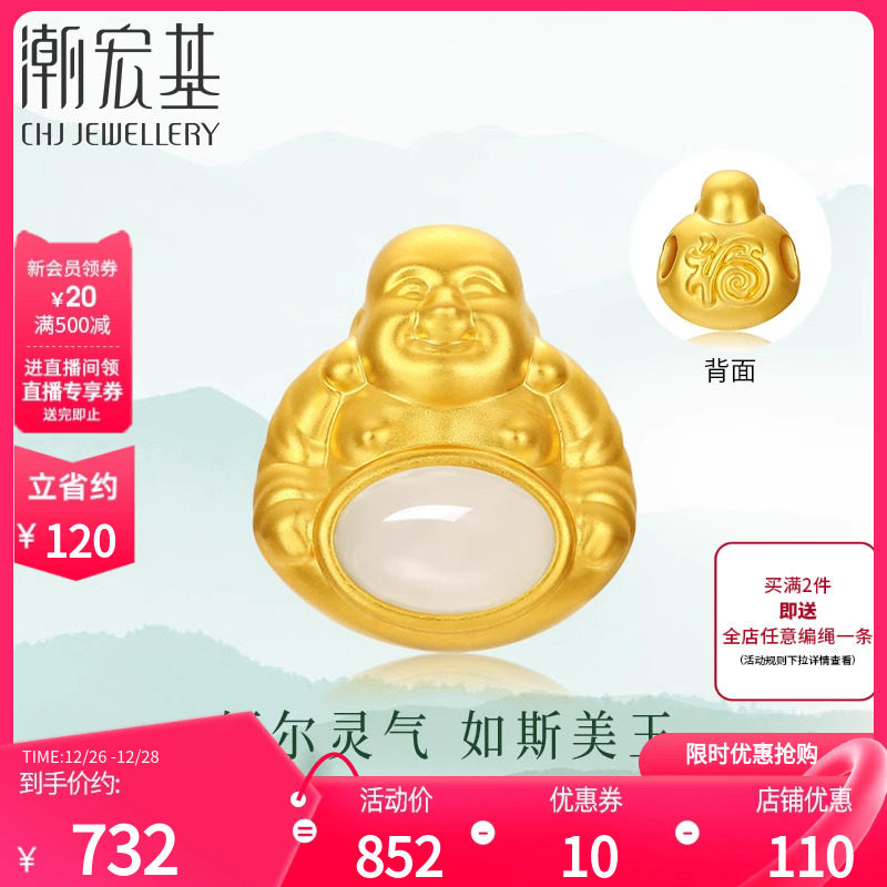 潮宏基倾玉足金和田玉弥勒佛串珠黄金吊坠金镶玉5D硬金女