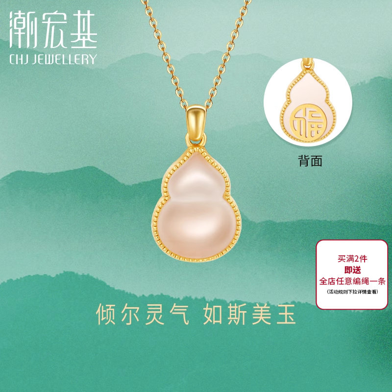 潮宏基倾玉黄金吊坠足金和田玉福器葫芦挂坠金镶玉5D硬金礼物颈饰