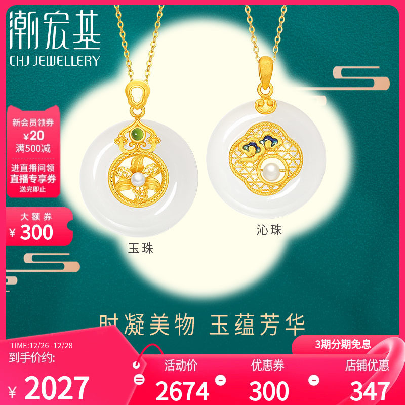 潮宏基颜如玉足金和田玉挂坠黄金金镶玉碧玉珍珠礼物送礼