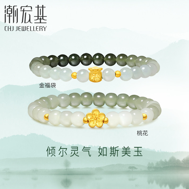 潮宏基倾玉足金和田玉手链黄金桃花金福袋手串金镶玉礼物