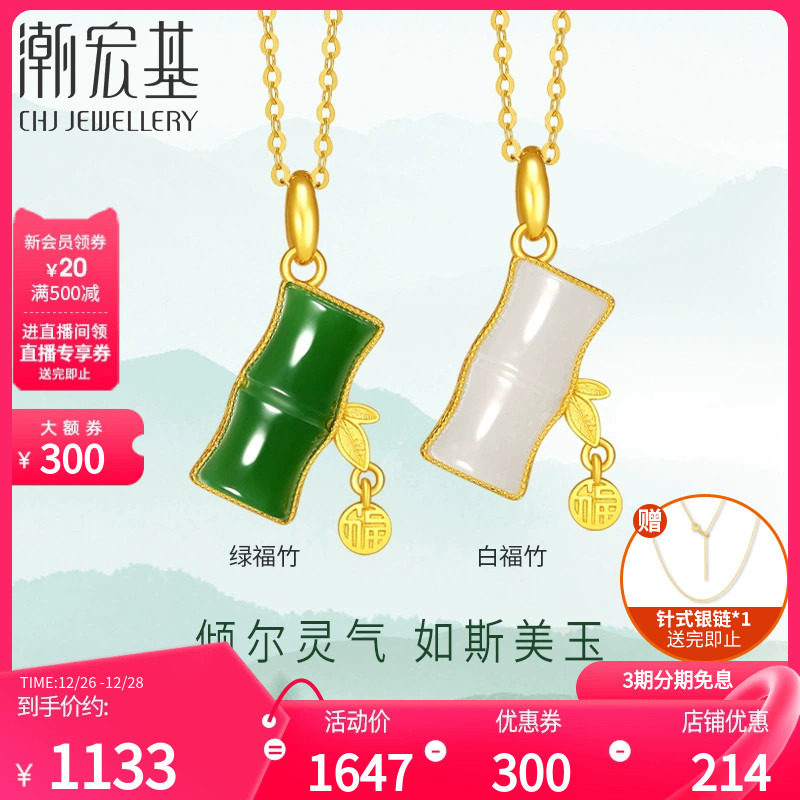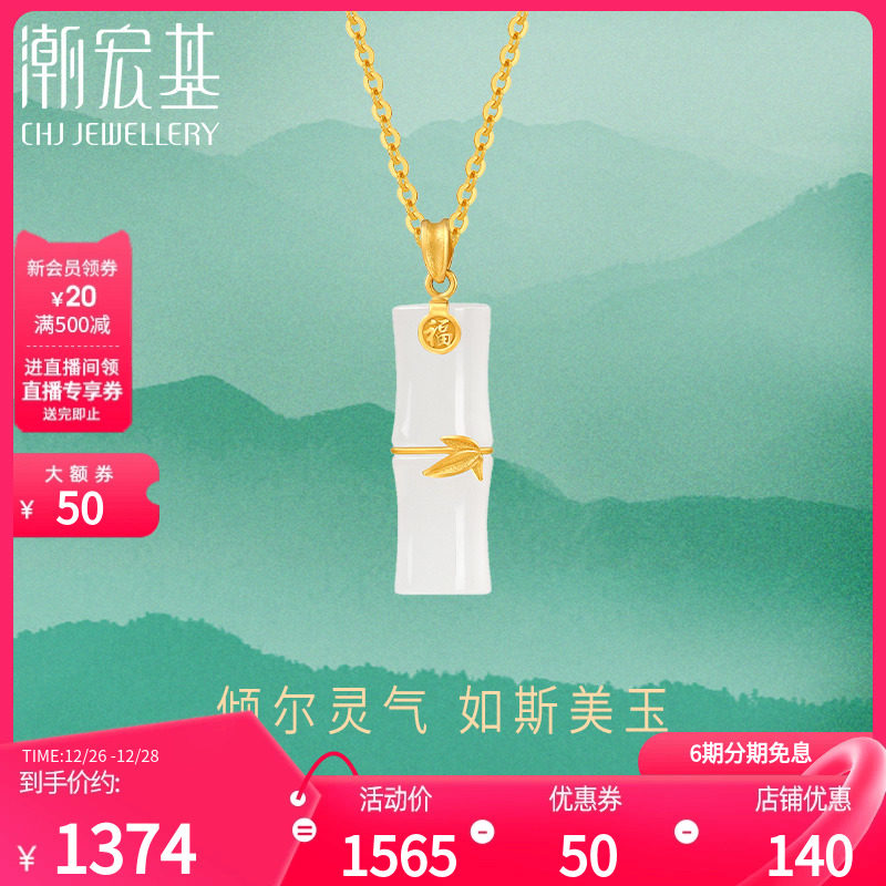 潮宏基倾玉足金挂坠黄金吊坠白绿福竹子和田玉不含链金镶玉
